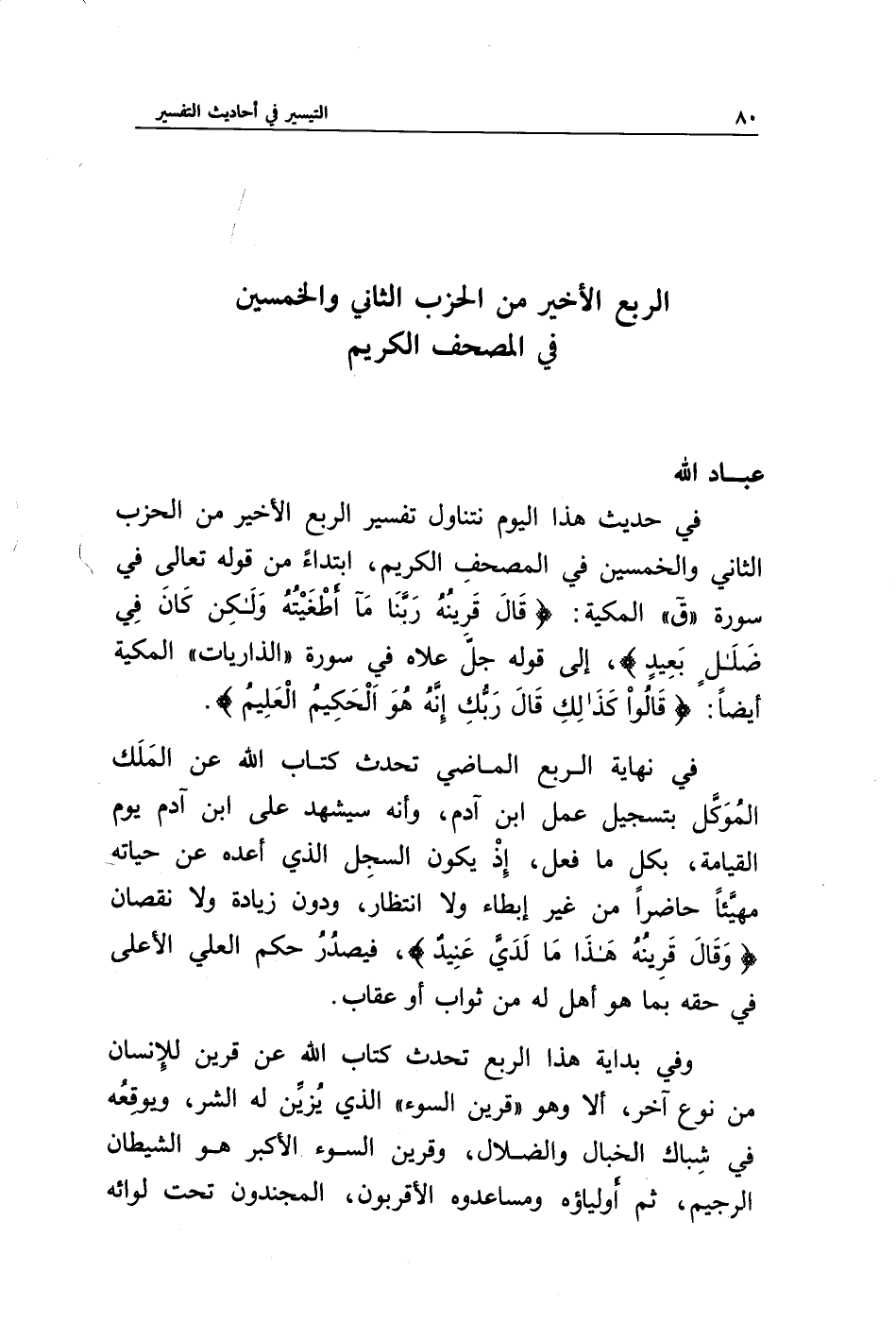 في حديث هذا اليوم نتناول تفسير الربع الأخير من الحزب الثاني والخمسين في المصحف الكريم، ابتداء من قوله تعالى في سورة "ق" المكية: {قَالَ قَرِينُهُ رَبَّنَا مَا أَطْغَيْتُهُ وَلَكِنْ كَانَ فِي ضَلَالٍ بَعِيدٍ}، إلى قوله جل علاه في سورة "الذاريات" المكية أيضا: {قَالُوا كَذَلِكِ قَالَ رَبُّكِ إِنَّهُ هُوَ الْحَكِيمُ الْعَلِيمُ}.