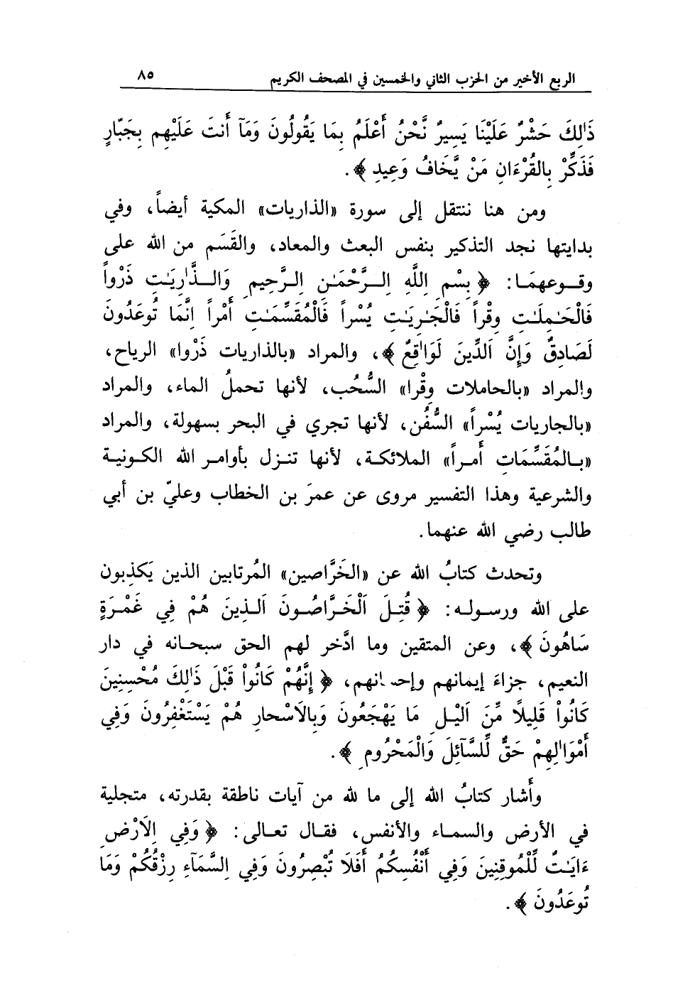 وتحدث كتاب الله عن " الخراصين " المرتابين الذين يكذبون على الله ورسوله: {قُتِلَ الْخَرَّاصُونَ * الَّذِينَ هُمْ فِي غَمْرَةٍ سَاهُونَ}، وعن المتقين وما ادخر لهم الحق سبحانه في دار النعيم، جزاء إيمانهم وإحسانهم، {إِنَّهُمْ كَانُوا قَبْلَ ذَلِكَ مُحْسِنِينَ * كَانُوا قَلِيلًا مِنَ اللَّيْلِ مَا يَهْجَعُونَ * وَبِالْأَسْحَارِ هُمْ يَسْتَغْفِرُونَ * وَفِي أَمْوَالِهِمْ حَقٌّ لِلسَّائِلِ وَالْمَحْرُومِ}.