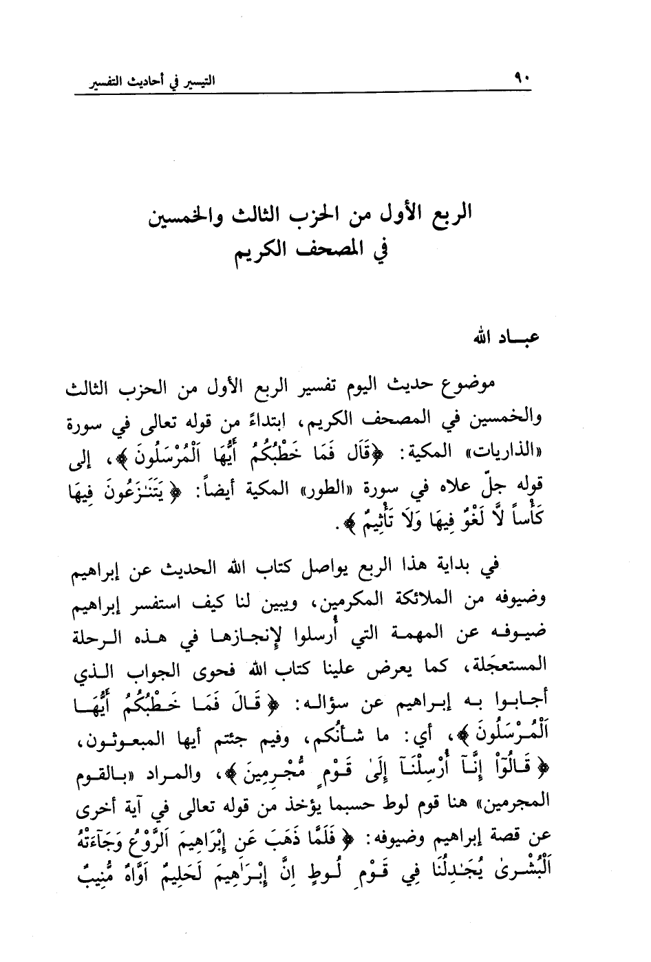 موضوع حديث اليوم تفسير الربع الأول من الحزب الثالث والخمسين في المصحف الكريم، ابمداء من قوله تعالى في سورة "الذاريات" المكية: {قَالَ فَمَا خَطْبُكُمْ أَيُّهَا الْمُرْسَلُونَ}، إلى قوله جل علاه في سورة "الطور" المكية أيضا: {يَتَنَازَعُونَ فِيهَا كَأْسًا لَا لَغْوٌ فِيهَا وَلَا تَأْثِيمٌ}.