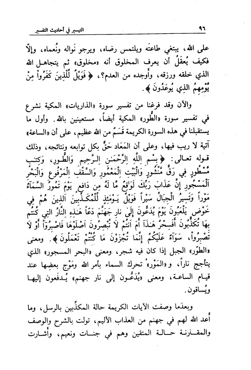 والآن وقد فرغنا من تفسير " سورة الذاريات " المكية نشرع في تفسير سورة " الطور " المكية أيضا، مستعينين بالله. وأول ما يستقبلنا في هذه السورة الكريمة قسم من الله عظيم، على أن " الساعة " آتية لا ريب فيها، وعلى أن المعاد حق بكل توابعه ونتائجه، وذلك قوله تعالى: {بسم الله الرحمن الرحيم وَالطُّورِ ** وَكِتَابٍ مَسْطُورٍ * فِي رَقٍّ مَنْشُورٍ * وَالْبَيْتِ الْمَعْمُورِ * وَالسَّقْفِ الْمَرْفُوعِ * وَالْبَحْرِ الْمَسْجُورِ * إِنَّ عَذَابَ رَبِّكَ لَوَاقِعٌ * مَا لَهُ مِنْ دَافِعٍ * يَوْمَ تَمُورُ السَّمَاءُ مَوْرًا * وَتَسِيرُ الْجِبَالُ سَيْرًا * فَوَيْلٌ يَوْمَئِذٍ لِلْمُكَذِّبِينَ * الَّذِينَ هُمْ فِي خَوْضٍ يَلْعَبُونَ * يَوْمَ يُدَعُّونَ إِلَى نَارِ جَهَنَّمَ دَعًّا * هَذِهِ النَّارُ الَّتِي كُنْتُمْ بِهَا تُكَذِّبُونَ * أَفَسِحْرٌ هَذَا أَمْ أَنْتُمْ لَا تُبْصِرُونَ * اصْلَوْهَا فَاصْبِرُوا أَوْ لَا تَصْبِرُوا سَوَاءٌ عَلَيْكُمْ إِنَّمَا تُجْزَوْنَ مَا كُنْتُمْ تَعْمَلُونَ}، ومعنى " الطور " الجبل إذا كان فيه شجر، ومعنى " البحر المسجور " الذي يتأجج نارا، و " المور " تحرك السماء بأمر الله وموج بعضها عند قيام الساعة، ومعنى " يدعون إلى نار جهنم " يدفعون إليها ويساقون.
