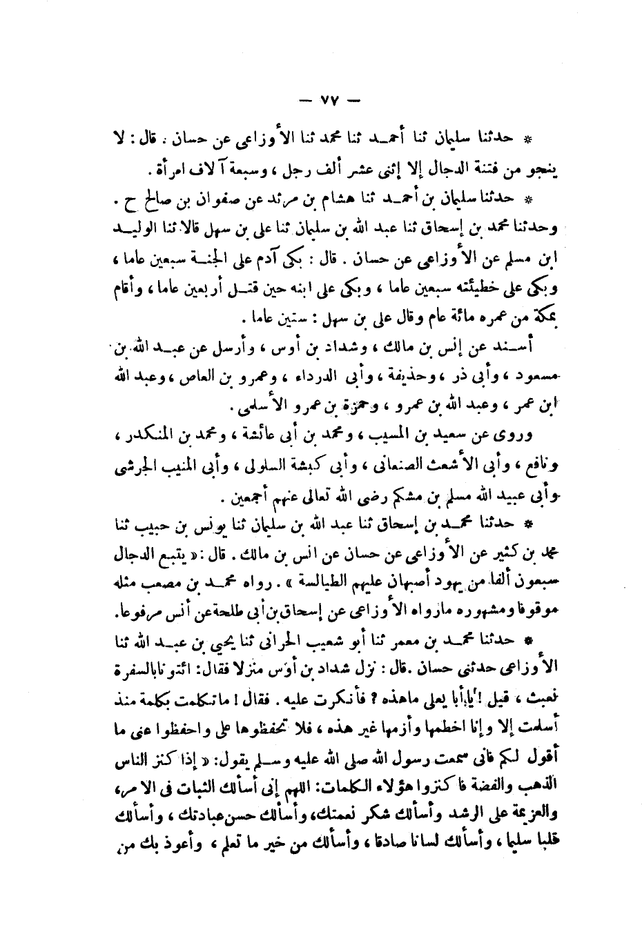 حَدَّثَنَا سُلَيْمَانُ , ثَنَا أَحْمَدُ , ثَنَا مُحَمَّدٌ , ثَنَا الْأَوْزَاعِيُّ , عَنْ حَسَّانَ , قَالَ: §لَا يَنْجُو مِنْ فِتْنَةِ الدَّجَّالِ إِلَّا اثْنَا عَشَرَ أَلْفِ رَجُلٍ وَسَبْعَةَ آلَافِ امْرَأَةٍ