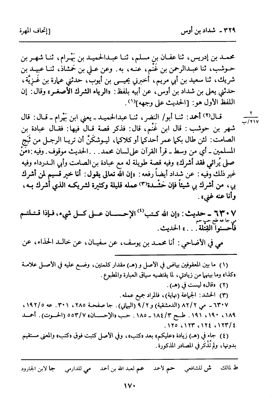 6307 - حَدِيثٌ (مي جا عه طح حب حم) : " إِنَّ اللَّهَ كَتَبَ الإِحْسَانَ عَلَى كُلٍّ شَيْءٍ، فَإِذَا قَتَلْتُمْ فَأَحْسِنُوا الْقِتْلَةَ. . . " الْحَدِيثَ.