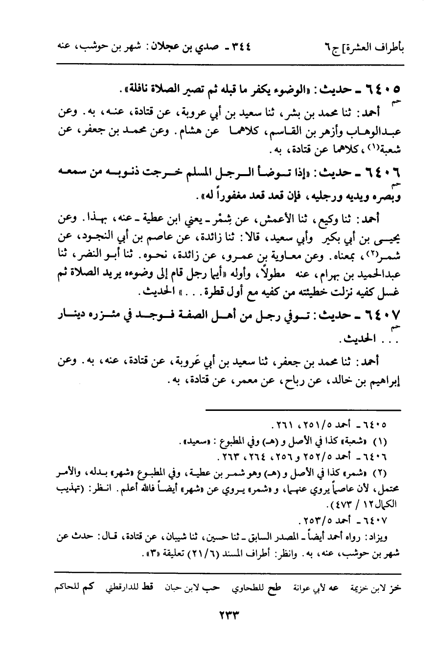 أَحْمَدُ: ثنا مُحَمَّدُ بْنُ بِشْرٍ، ثنا سَعِيدُ بْنُ أَبِي عَرُوبَةَ، عَنْ قَتَادَةَ، عَنْهُ، بِهِ. وَعَنْ عَبْدِ الْوَهَّابِ، وَأَزْهَرَ بْنِ الْقَاسِمِ، كِلاهُمَا عَنْ هِشَامٍ. وَعَنْ مُحَمَّدِ بْنِ جَعْفَرٍ، عَنْ شُعْبَةَ، كِلاهُمَا عَنْ قَتَادَةَ، بِهِ. .
