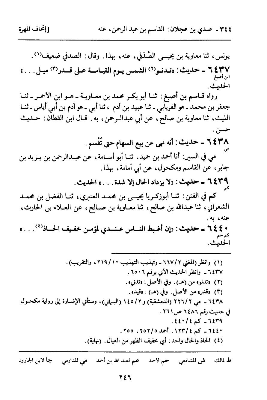 كم فِي الْفِتَنِ: ثنا أَبُو زَكَرِيَّا يَحْيَى بْنُ مُحَمَّدٍ الْعَنْبَرِيُّ، ثنا الْفَضْلُ بْنُ مُحَمَّدٍ الشَّعْرَانِيُّ، ثنا عَبْدُ اللَّهِ بْنُ صَالِحٍ، ثنا مُعَاوِيَةُ بْنُ صَالِحٍ، عَنِ الْعَلاءِ بْنِ الْحَارِثِ، عَنْهُ، بِهِ. .