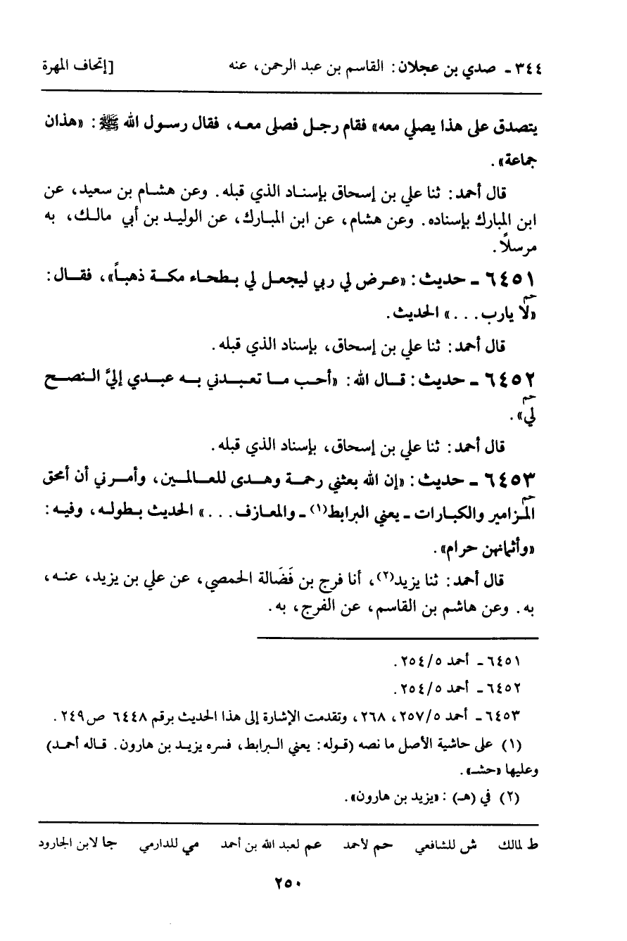 6453 - حَدِيثٌ (حم) : " إِنَّ اللَّهَ بَعَثَنِي رَحْمَةً وَهُدًى لِلْعَالَمِينَ، وَأَمَرَنِي أَنْ أَمْحَقَ الْمَزَامِيرَ وَالْكِنَّارَاتِ؛ يَعْنِي: الْبَرَابِطَ، وَالْمَعَازِفَ. . . " الْحَدِيثَ بِطُولِهِ، وَفِيهِ: " وَأَثْمَانُهُنَّ حَرَامٌ ".