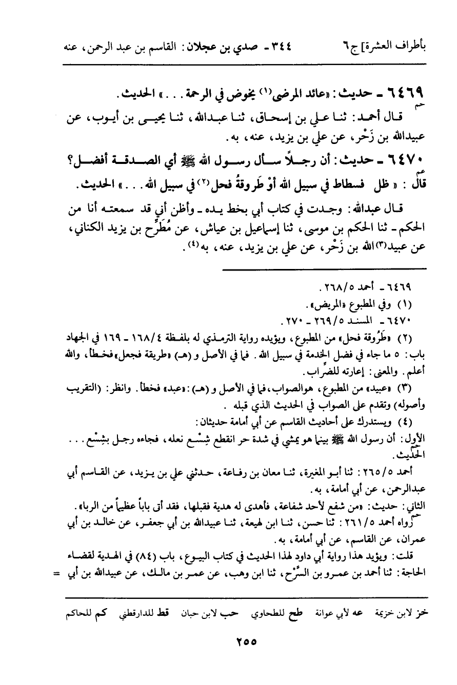 6469 - حَدِيثٌ (حم) : " عَائِدُ الْمَرْضَى يَخُوضُ فِي الرَّحْمَةِ. . . " الْحَدِيثَ.