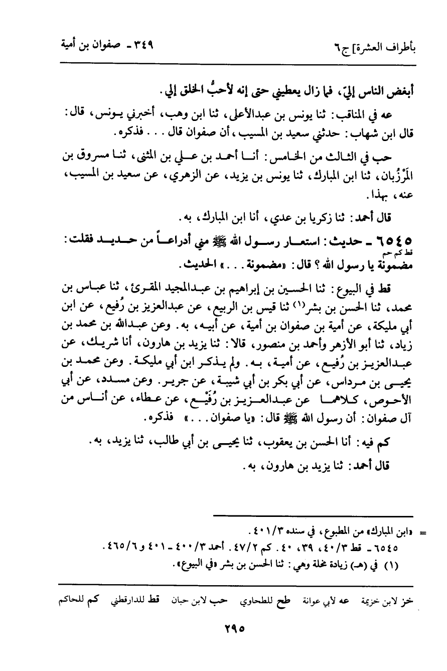 قط فِي الْبُيُوعِ: ثنا الْحُسَيْنُ بْنُ إِبْرَاهِيمَ بْنِ عَبْدِ الْمَجِيدِ الْمُقْرِئُ، ثنا عَبَّاسُ بْنُ مُحَمَّدٍ، ثنا الْحَسَنُ بْنُ بِشْرٍ، ثنا قَيْسُ بْنُ الرَّبِيعِ، عَنْ عَبْدِ الْعَزِيزِ بْنِ رُفَيْعٍ، عَنِ ابْنِ أَبِي مُلَيْكَةَ، عَنْ أُمَيَّةَ بْنِ صَفْوَانَ بْنِ أُمَيَّةَ، عَنْ أَبِيهِ، بِهِ. وَعَنْ عَبْدِ اللَّهِ بْنِ مُحَمَّدِ بْنِ زِيَادٍ، ثنا أَبُو الأَزْهَرِ، وَأَحْمَدُ بْنُ مَنْصُورٍ، قَالا: ثنا يَزِيدُ بْنُ هَارُونَ، أنا شَرِيكٌ، عَنْ عَبْدِ الْعَزِيزِ بْنِ رُفَيْعٍ، عَنْ أُمَيَّةَ، بِهِ. وَلَمْ يَذْكُرِ ابْنَ أَبِي مُلَيْكَةَ. وَعَنْ مُحَمَّدِ بْنِ يَحْيَى بْنِ مِرْدَاسٍ، عَنْ أَبِي بَكْرٍ ابْنِ أَبِي شَيْبَةَ، عَنْ جَرِيرٍ. وَعَنْ مُسَدَّدٍ، عَنْ أَبِي الأَحْوَصِ، كِلاهُمَا عَنْ عَبْدِ الْعَزِيزِ بْنِ رُفَيْعٍ، عَنْ عَطَاءٍ، عَنْ أُنَاسٍ مِنْ آلِ صَفْوَانَ: أَنَّ رَسُولَ اللَّهِ، صَلَّى اللَّهُ عَلَيْهِ وَسَلَّمَ، قَالَ: " يَا صَفْوَانُ. . . " فَذَكَرَهُ.