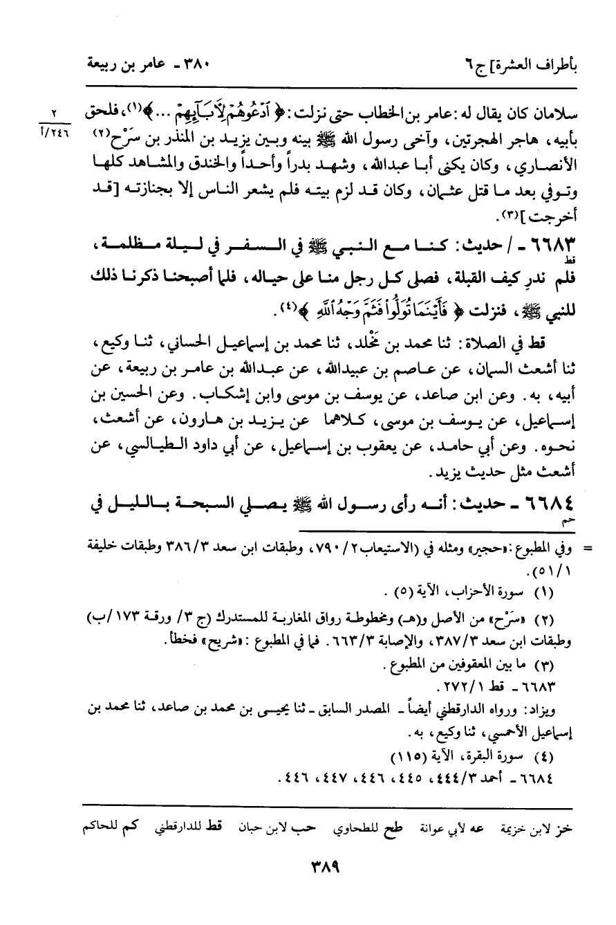 قط فِي الصَّلاةِ: ثنا مُحَمَّدُ بْنُ مَخْلَدٍ، ثنا مُحَمَّدُ بْنُ إِسْمَاعِيلَ الْحَسَّانِيُّ، ثنا وَكِيعٌ، ثنا أَشْعَثُ بْنُ السَّمَّانِ، عَنْ عَاصِمِ بْنِ عُبَيْدِ اللَّهِ، عَنْ عَبْدِ اللَّهِ بْنِ عَامِرِ بْنِ رَبِيعَةَ، عَنْ أَبِيهِ، بِهِ. وَعَنِ ابْنِ صَاعِدٍ، عَنْ يُوسُفَ بْنِ مُوسَى، وَابْنِ إِشْكَابٍ. وَعَنِ الْحُسَيْنِ بْنِ إِسْمَاعِيلَ، عَنْ يُوسُفَ بْنِ مُوسَى، كِلاهُمَا عَنْ يَزِيدَ بْنِ هَارُونَ، عَنْ أَشْعَثَ، نَحْوَهُ. وَعَنْ أَبِي حَامِدٍ، عَنْ يَعْقُوبَ بْنِ إِسْمَاعِيلَ، عَنْ أَبِي دَاوُدَ الطَّيَالِسِيِّ، عَنْ أَشْعَثَ، مِثْلَ حَدِيثِ يَزِيدَ. .