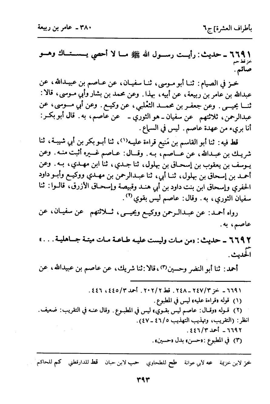 قط فِيهِ: ثنا أَبُو الْقَاسِمِ بْنُ مَنِيعٍ، قِرَاءَةً عَلَيْهِ، ثنا أَبُو بَكْرِ ابْنُ أَبِي شَيْبَةَ، ثنا شَرِيكُ بْنُ عَبْدِ اللَّهِ، عَنْ عَاصِمٍ، بِهِ. وَقَالَ: عَاصِمٌ غَيْرُهُ أَثْبَتُ مِنْهُ. وَعَنْ يُوسُفَ بْنِ يَعْقُوبَ بْنِ إِسْحَاقَ بْنِ بُهْلُولٍ، ثنا جَدِّي، ثنا ابْنُ مَهْدِيٍّ، بِهِ. وَعَنْ أَحْمَدَ بْنِ إِسْحَاقَ بْنِ بُهْلُولٍ، ثنا أَبِي، ثنا عَبْدُ الرَّحْمَنِ بْنُ مَهْدِيٍّ، وَوَكِيعٌ، وَأَبُو دَاوُدَ الْحَفَرِيُّ، وَإِسْحَاقُ ابْنُ بِنْتِ دَاوُدَ بْنِ أَبِي هِنْدٍ، وَقَبِيصَةُ، وَإِسْحَاقُ الأَزْرَقُ، قَالُوا: ثنا سُفْيَانُ الثَّوْرِيُّ، بِهِ. وَقَالَ: عَاصِمٌ لَيْسَ بِقَوِيٍّ.