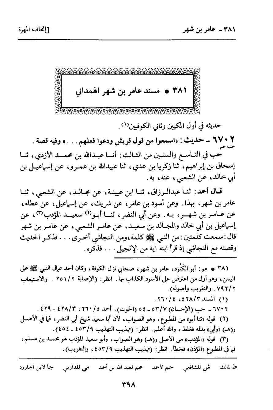 381 ـ مُسْنَدُ عَامِرِ بْنِ شَهْرٍ الْهَمْدَانِيِّ.