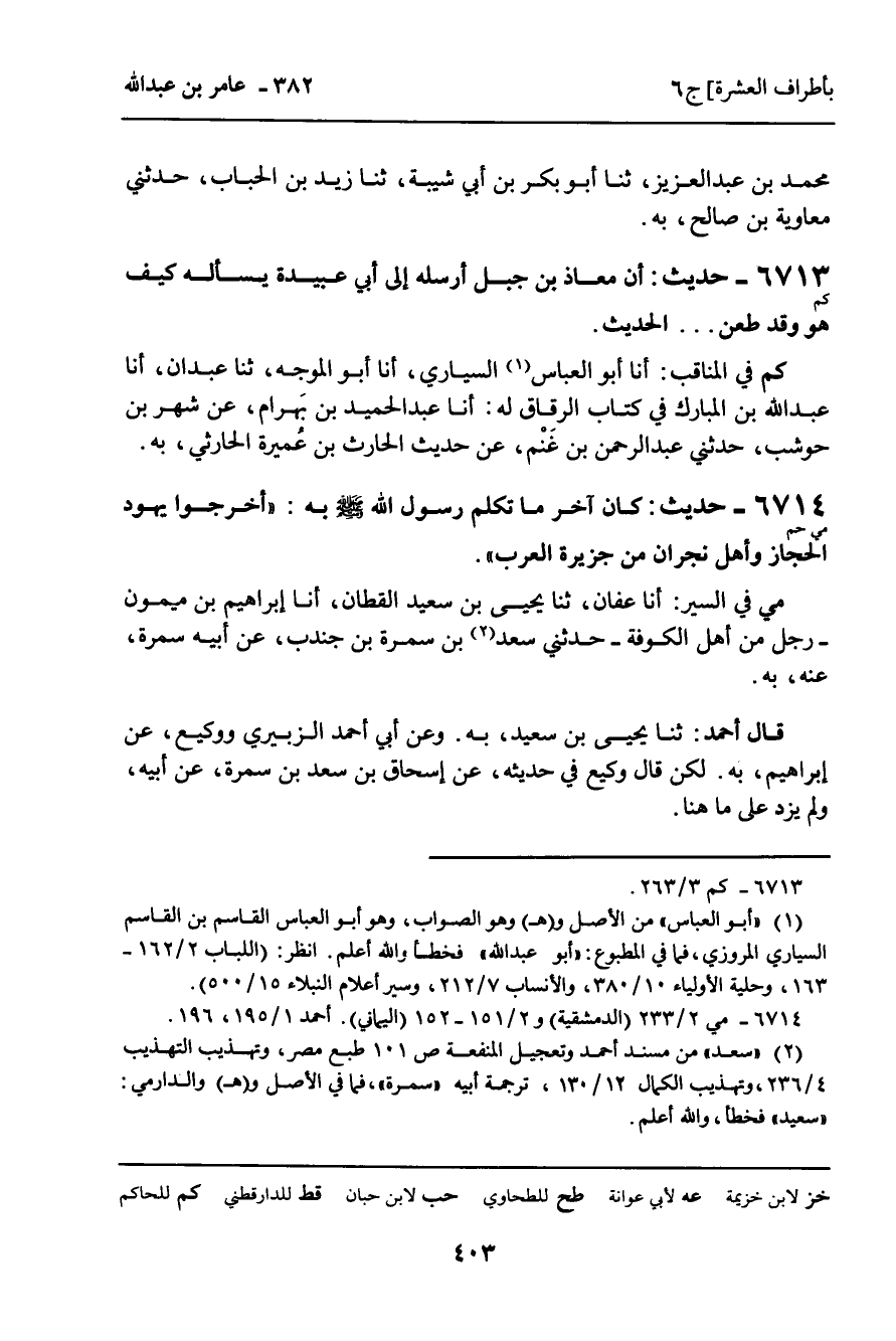 6713 - حَدِيثٌ (كم) : أَنَّ مُعَاذَ بْنَ جَبَلٍ أَرْسَلَهُ إِلَى أَبِي عُبَيْدَةَ يَسْأَلُهُ كَيْفَ هُوَ وَقَدْ طُعِنَ. . . الْحَدِيثَ.