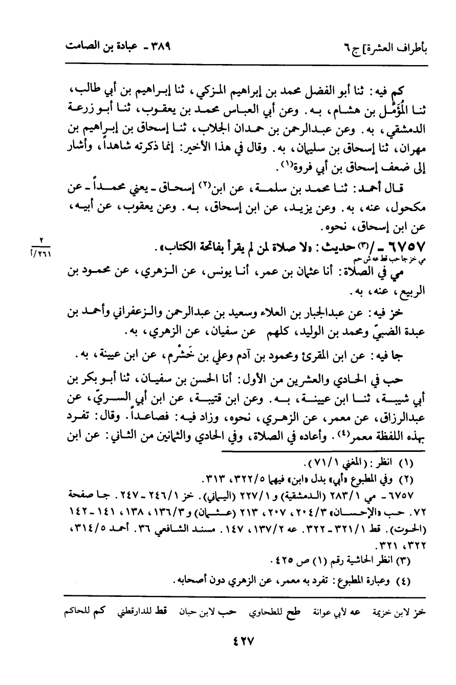 6757 - حَدِيثٌ (مي خز جا حب قط عه ش حم) : " لا صَلاةَ لِمَنْ لَمْ يَقْرَأْ بِفَاتِحَةِ الْكِتَابِ ".