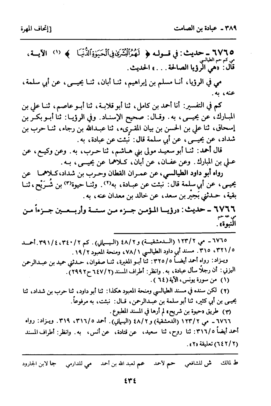 كم فِي التَّفْسِيرِ: أنا أَحْمَدُ بْنُ كَامِلٍ، ثنا أَبُو قِلابَةَ، ثنا أَبُو عَاصِمٍ، ثنا عَلِيُّ بْنُ الْمُبَارَكِ، عَنْ يَحْيَى، بِهِ. وَقَالَ: صَحِيحُ الإِسْنَادِ. وَفِي الرُّؤْيَا: ثنا أَبُو بَكْرِ بْنُ إِسْحَاقَ، ثنا عَلِيُّ بْنُ الْحَسَنِ بْنِ بَيَانٍ الْمُقْرِئُ، ثنا عَبْدُ اللَّهِ بْنُ رَجَاءٍ، ثنا حَرْبُ بْنُ شَدَّادٍ، عَنْ يَحْيَى، عَنْ أَبِي سَلَمَةَ، قَالَ: نُبِّئْتُ عَنْ عُبَادَةَ، بِهِ.