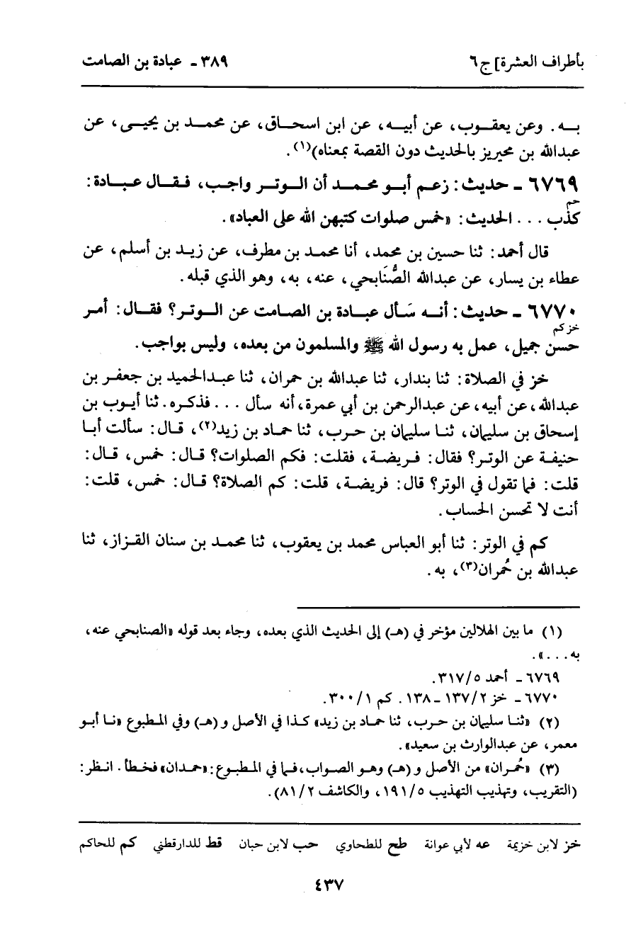 6769 - حَدِيثٌ (حم) : زَعَمَ أَبُو مُحَمَّدٍ أَنَّ الْوِتْرَ وَاجِبٌ، فَقَالَ عُبَادَةُ: كَذَبَ. . . الْحَدِيثُ: " خَمْسُ صَلَوَاتٍ كَتَبَهُنَّ اللَّهُ عَلَى الْعِبَادِ ".