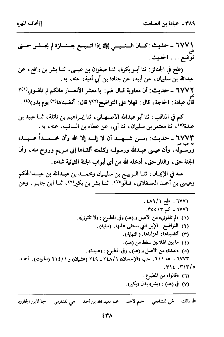 6772 - حَدِيثٌ (كم) : أَنَّ مُعَاوِيَةَ قَالَ لَهُمْ: يَا مَعْشَرَ الأَنْصَارِ، مَا لَكُمْ لَمْ تَلْقَوْنِي؟ قَالَ عُبَادَةُ: الْحَاجَةُ، قَالَ: فَهَلا عَلَى النَّوَاضِحِ قَالَ: أَنْضَيْنَاهَا يَوْمَ بَدْرٍ.