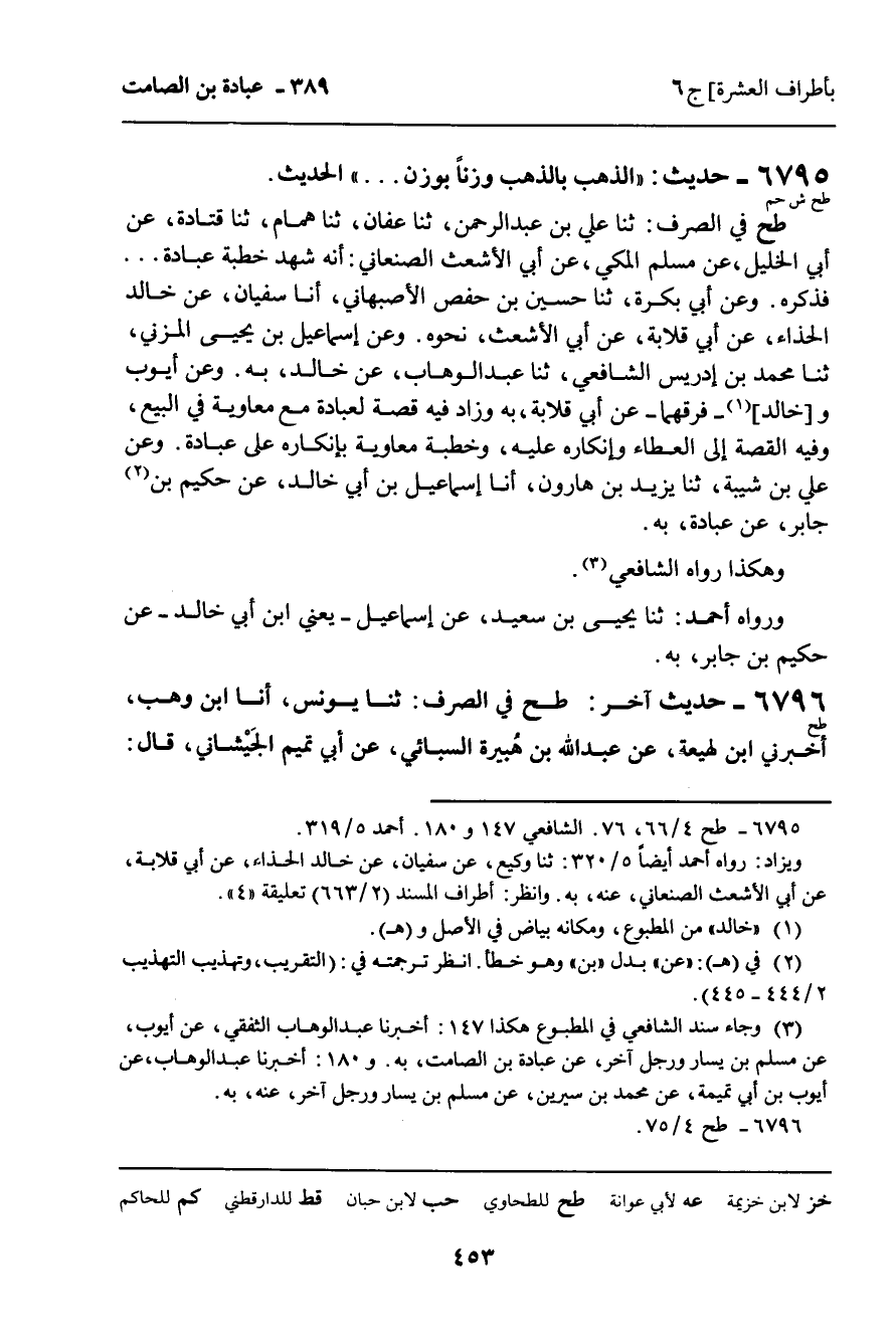 طح فِي الصَّرْفِ: ثنا عَلِيُّ بْنُ عَبْدِ الرَّحْمَنِ، ثنا عَفَّانُ، ثنا هَمَّامٌ، ثنا قَتَادَةُ، عَنْ أَبِي الْخَلِيلِ، عَنْ مُسْلِمٍ الْمَكِّيِّ، عَنْ أَبِي الأَشْعَثِ الصَّنْعَانِيِّ: أَنَّهُ شَهِدَ خُطْبَةَ عُبَادَةَ. . فَذَكَرَهُ. وَعَنْ أَبِي بَكْرَةَ، ثنا حُسَيْنُ بْنُ حَفْصٍ الأَصْبَهَانِيُّ، أنا سُفْيَانُ، عَنْ خَالِدٍ الْحَذَّاءِ، عَنْ أَبِي قِلابَةَ، عَنْ أَبِي الأَشْعَثِ، نَحْوَهُ. وَعَنْ إِسْمَاعِيلَ بْنِ يَحْيَى الْمُزَنِيِّ، ثنا مُحَمَّدُ بْنُ إِدْرِيسَ الشَّافِعِيُّ، ثنا عَبْدُ الْوَهَّابِ، عَنْ خَالِدٍ، بِهِ. وَعَنْ أَيُّوبَ، وَخَالِدٍ، فَرَّقَهُمَا، عَنْ أَبِي قِلابَةَ، بِهِ وَزَادَ فِيهِ قِصَّةً لِعُبَادَةَ مَعَ مُعَاوِيَةَ فِي الْبَيْعِ، وَفِيهِ الْقِصَّةُ إِلَى الْعَطَاءِ وَإِنْكَارِهِ عَلَيْهِ، وَخُطْبَةُ مُعَاوِيَةَ بِإِنْكَارِهِ عَلَى عُبَادَةَ. وَعَنْ عَلِيِّ بْنِ شَيْبَةَ، ثنا يَزِيدُ بْنُ هَارُونَ، أنا إِسْمَاعِيلُ بْنُ أَبِي خَالِدٍ، عَنْ حَكِيمِ بْنِ جَابِرٍ، عَنْ عُبَادَةَ، بِهِ.