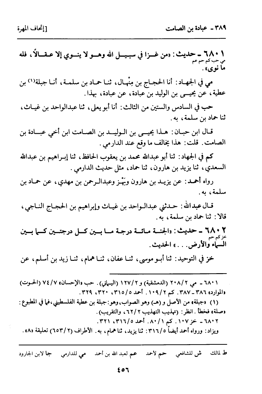 مي فِي الْجِهَادِ: أنا الْحَجَّاجُ بْنُ مِنْهَالٍ، ثنا حَمَّادُ بْنُ سَلَمَةَ، أنا جَبَلَةُ بْنُ عَطِيَّةَ، عَنْ يَحْيَى بْنِ الْوَلِيدِ بْنِ عُبَادَةَ، عَنْ عُبَادَةَ، بِهَذَا.
