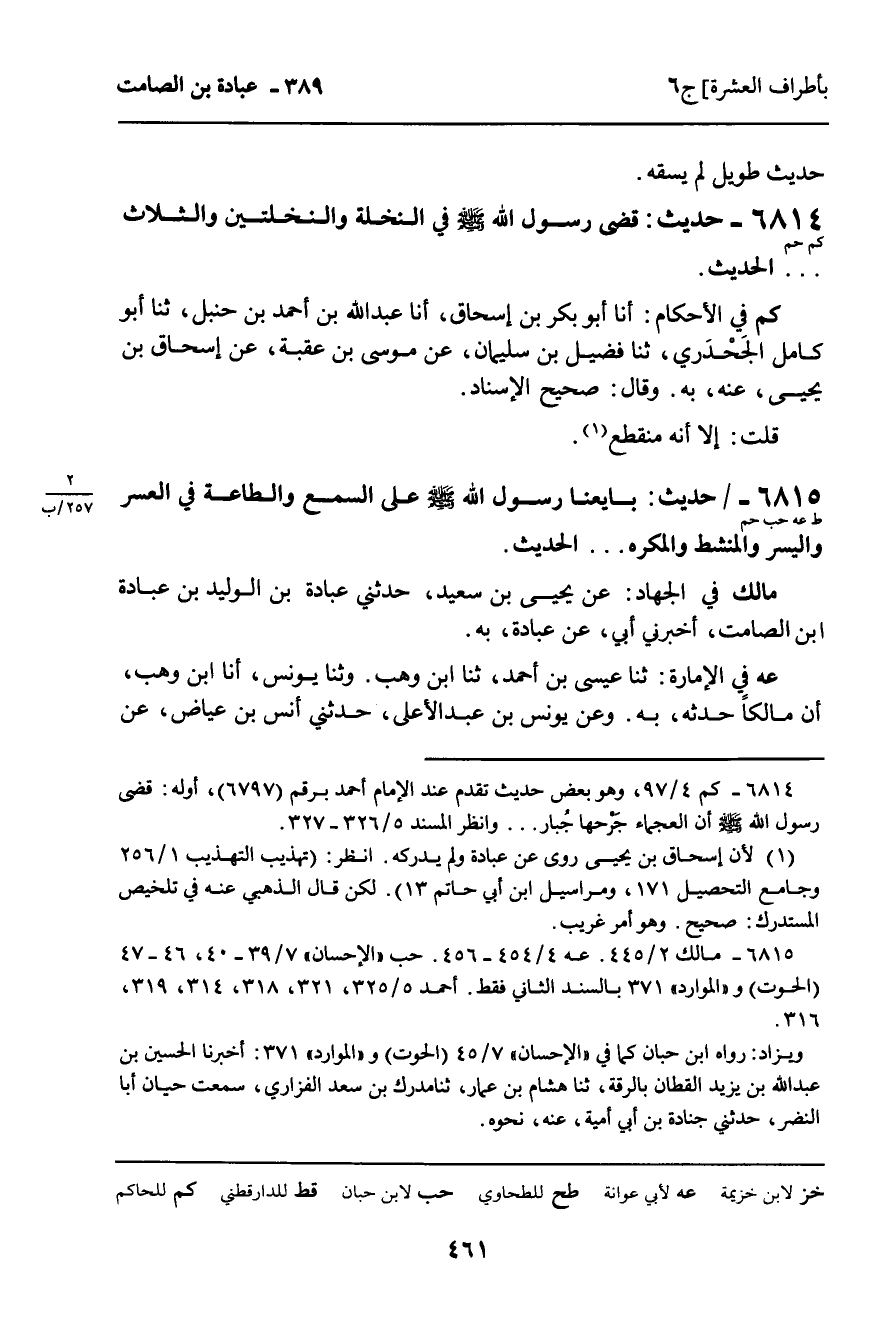 6815 - حَدِيثٌ (ط عه حب حم) : بَايَعْنَا رَسُولَ اللَّهِ، صَلَّى اللَّهُ عَلَيْهِ وَسَلَّمَ، عَلَى السَّمْعِ وَالطَّاعَةِ فِي الْعُسْرِ وَالْيُسْرِ وَالْمَنْشَطِ وَالْمَكْرَهِ. . . الْحَدِيثَ.