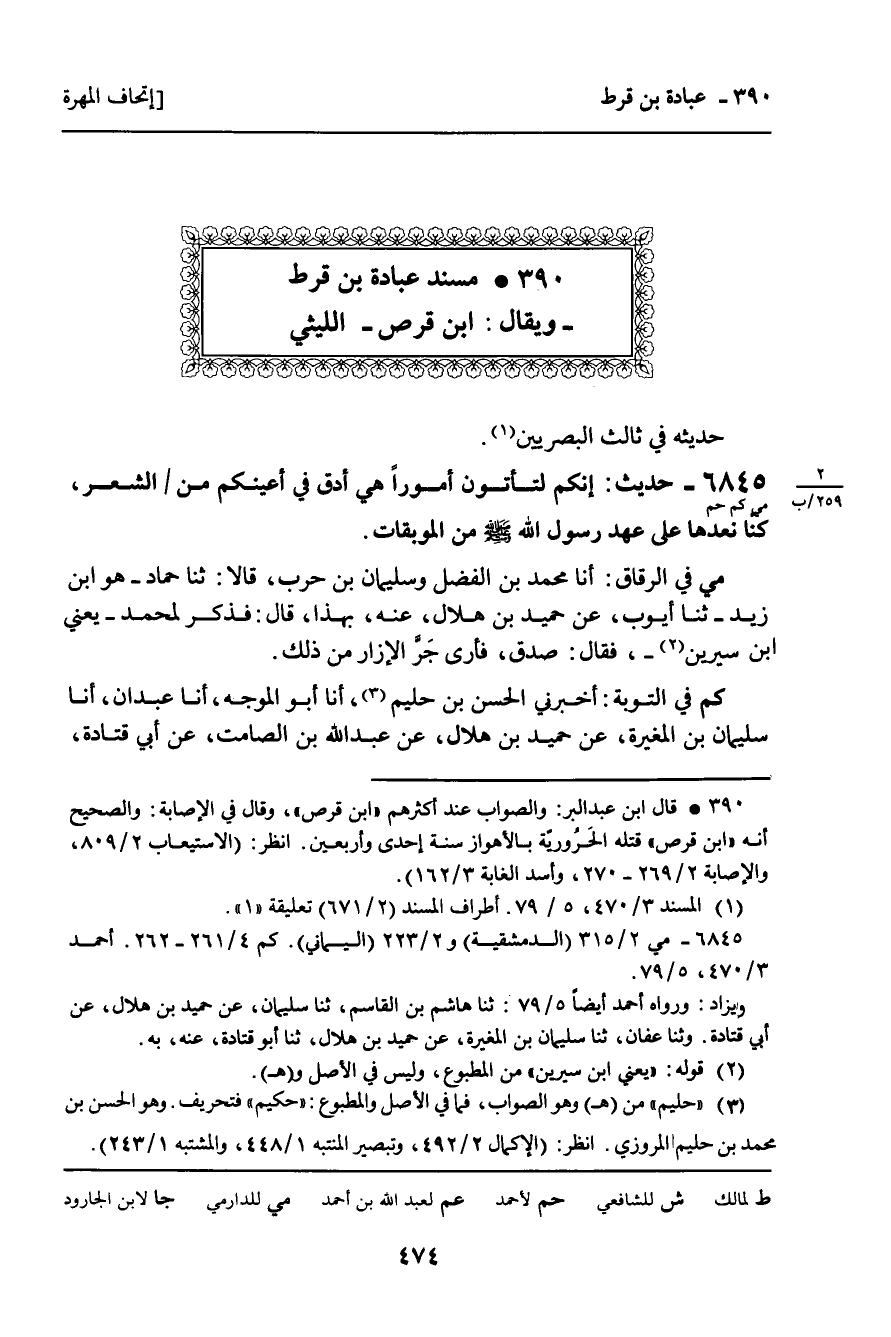 قَالَ أَحْمَدُ: ثنا إِسْمَاعِيلُ، ثنا أَيُّوبُ، عَنْ حُمَيْدِ بْنِ هِلالٍ، قَالَ: قَالَ عُبَادَةُ بْنُ قُرْطٍ. . . فَذَكَرَهُ.