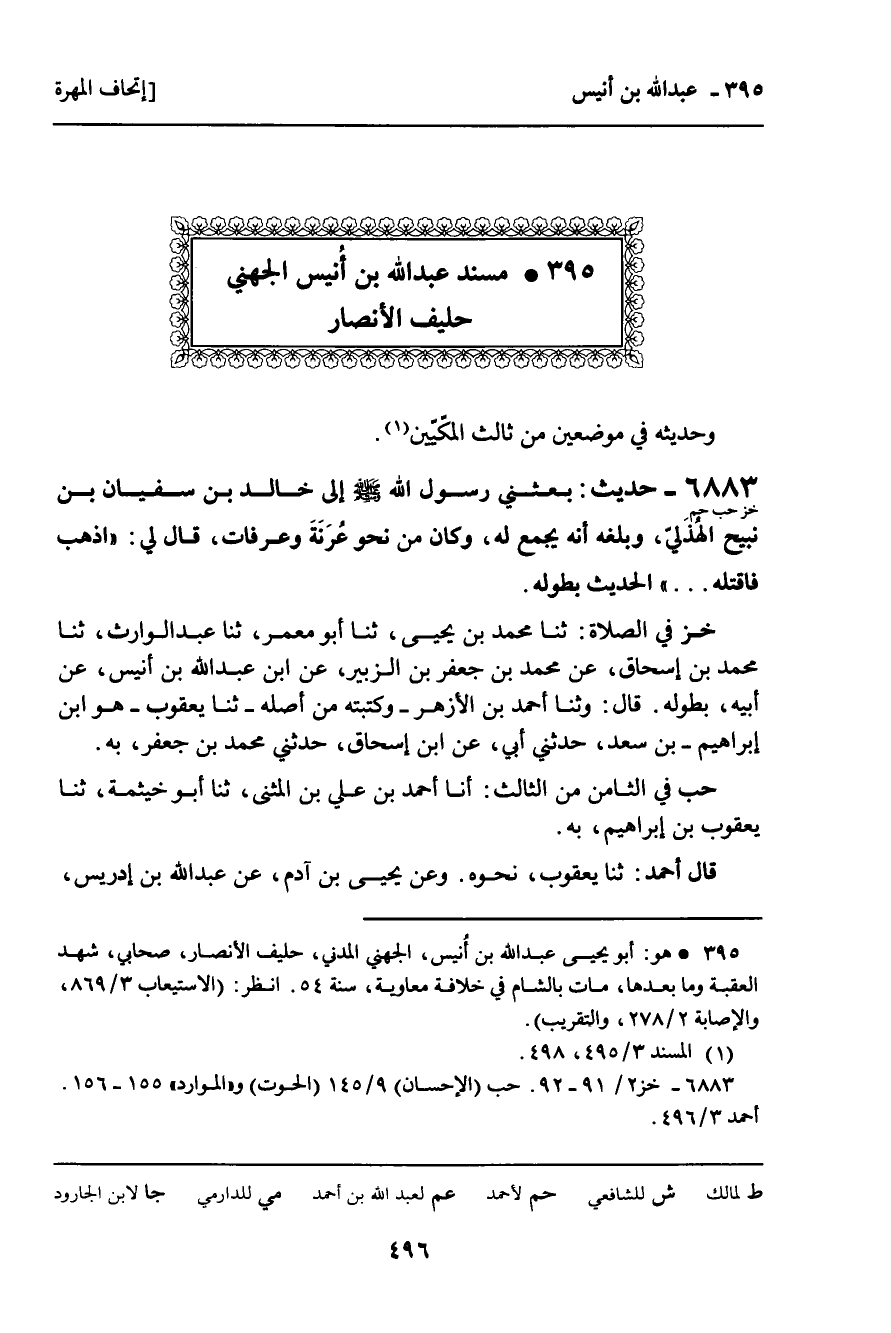 395 ـ مُسْنَدُ عَبْدِ اللَّهِ بْنِ أُنَيْسٍ الْجُهَنِيِّ حَلِيفِ الأَنْصَارِ.