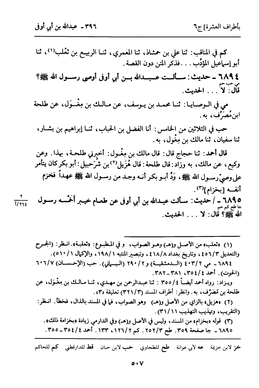 6894 - حَدِيثٌ (مي حب حم) : سَأَلْتُ عَبْدَ اللَّهِ بْنَ أَبِي أَوْفَى أَوْصَى رَسُولُ اللَّهِ، صَلَّى اللَّهُ عَلَيْهِ وَسَلَّمَ؟ قَالَ: لا. . . الْحَدِيثَ.