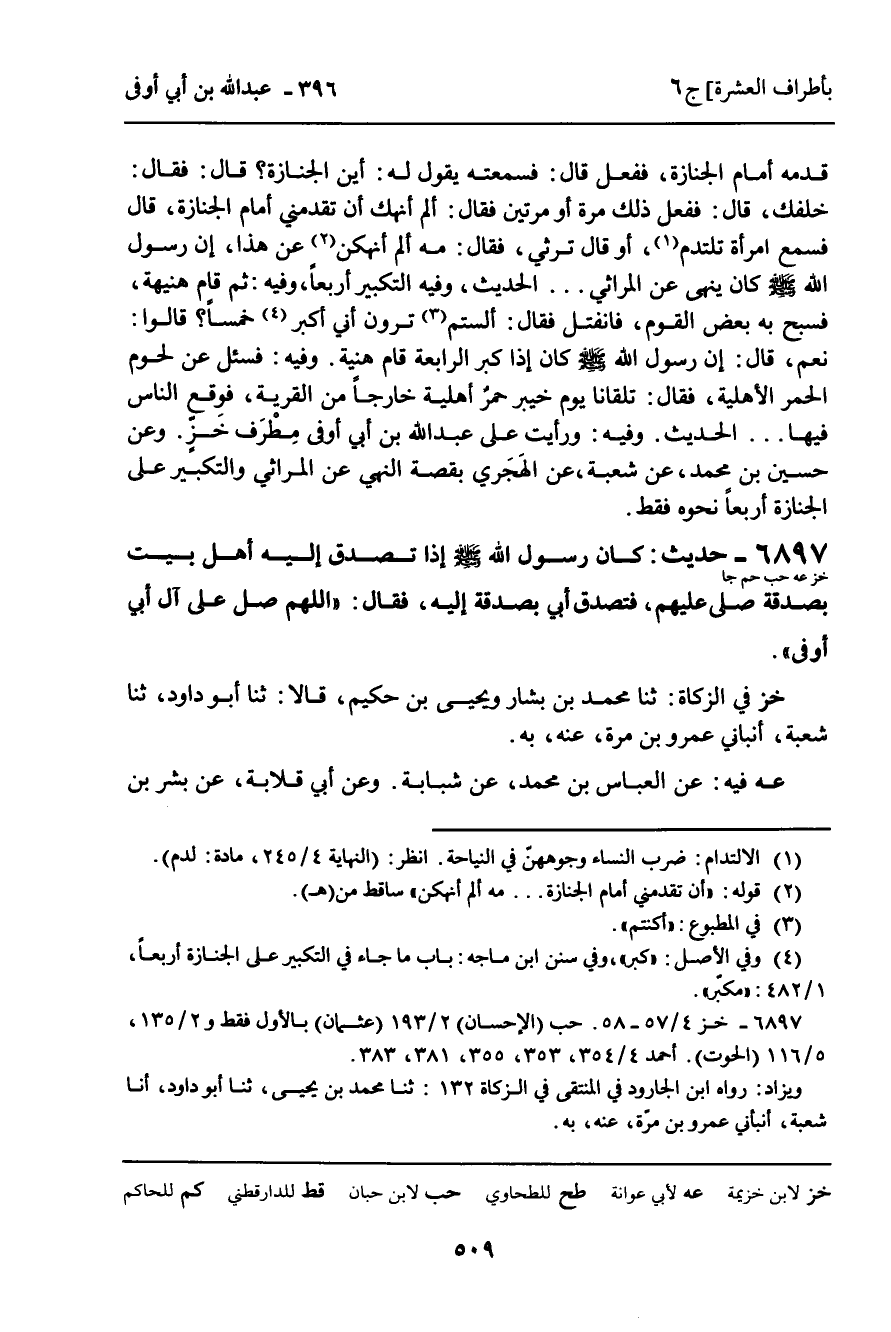 6897 - حَدِيثٌ (خز عه حب حم جا) : كَانَ رَسُولُ اللَّهِ، صَلَّى اللَّهُ عَلَيْهِ وَسَلَّمَ، إِذَا تَصَدَّقَ إِلَيْهِ أَهْلُ بَيْتٍ بِصَدَقَةٍ صَلَّى عَلَيْهِمْ، فَتَصَدَّقَ أَبِي بِصَدَقَةٍ إِلَيْهِ، فَقَالَ: " اللَّهُمَّ صَلِّ عَلَى آلِ أَبِي أَوْفَى ".