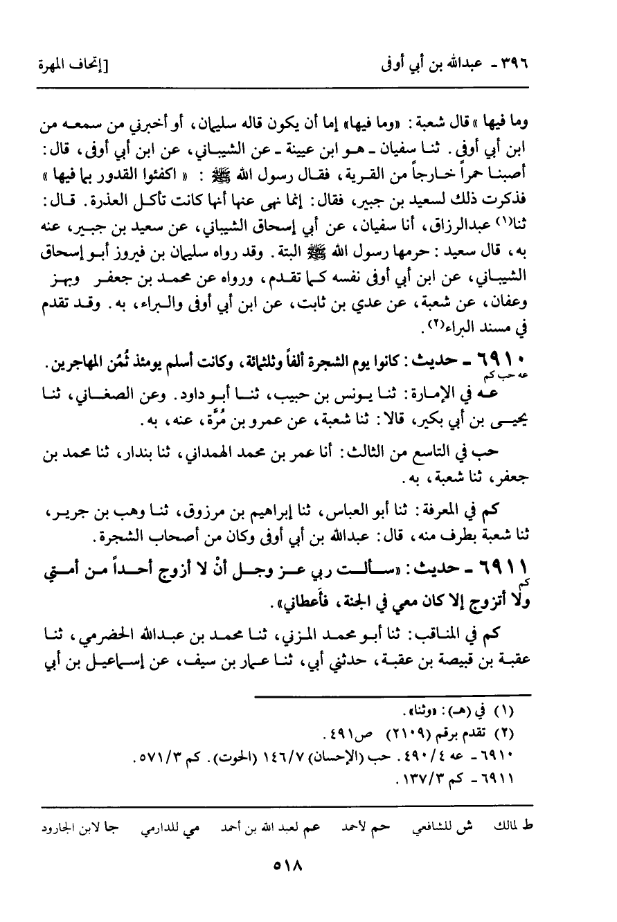 كم فِي الْمَعْرِفَةِ: ثنا أَبُو الْعَبَّاسِ، ثنا إِبْرَاهِيمُ بْنُ مَرْزُوقٍ، ثنا وَهْبُ بْنُ جَرِيرٍ، ثنا شُعْبَةُ، بِطَرَفٍ مِنْهُ، قَالَ: عَبْدُ اللَّهِ بْنُ أَبِي أَوْفَى وَكَانَ مِنْ أَصْحَابِ الشَّجَرَةِ. .