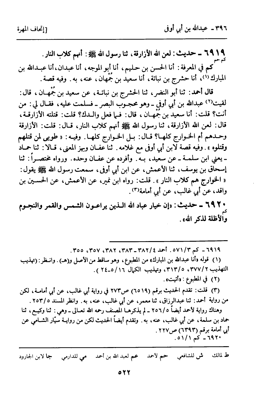 قَالَ أَحَمْدُ: ثنا أَبُو النَّضْرِ، ثنا الْحَشْرَجُ بْنُ نُبَاتَةَ، عَنْ سَعِيدِ بْنِ جُمْهَانَ، قَالَ: لَقِيتُ عَبْدَ اللَّهِ بْنَ أَبِي أَوْفَى، وَهُوَ مَحْجُوبُ الْبَصَرِ، فَسَلَّمْتُ عَلَيْهِ، فَقَالَ لِي: مَنْ أَنْتَ؟ قُلْتُ: أَنَا سَعِيدُ بْنُ جُمْهَانَ، قَالَ: فَمَا فَعَلَ وَالِدُكَ؟ قُلْتُ: قَتَلَتْهُ الأَزَارِقَةُ، قَالَ: لَعَنَ اللَّهُ الأَزَارِقَةَ، ثنا رَسُولُ اللَّهِ، صَلَّى اللَّهُ عَلَيْهِ وَسَلَّمَ، أَنَّهُمْ كِلابُ النَّارِ، قَالَ: قُلْتُ: الأَزَارِقَةُ وَحْدَهُمْ، أَمِ الْخَوَارِجُ كُلَّهَا؟ قَالَ: بَلِ الْخَوَارِجُ كُلُّهَا. وَفِيهِ: " طُوبَى لِمَنْ قَتَلَهُمْ وَقَتَلُوهُ ". وَفِيهِ قِصَّةٌ لابْنِ أَبِي أَوْفَى مَعَ غُلامِهِ. ثنا عَفَّانُ، وَبَهْزٌ، الْمَعْنَى، قَالا: ثنا حَمَّادٌ؛ يَعْنِي: ابْنَ سَلَمَةَ، عَنْ سَعِيدٍ، بِهِ. وَأَفْرَدَهُ عَنْ عَفَّانَ وَحْدَهُ. وَرَوَاهُ مُخْتَصَرًا: ثنا إِسْحَاقُ بْنُ يُوسُفَ، ثنا الأَعْمَشُ، عَنِ ابْنِ أَبِي أَوْفَى، سَمِعْتُ رَسُولَ اللَّهِ، صَلَّى اللَّهُ عَلَيْهِ وَسَلَّمَ، يَقُولُ: " الْخَوَارِجُ هُمْ كِلابُ النَّارِ ". قُلْتُ: رَوَاهُ ابْنُ نُمَيْرٍ، عَنِ الأَعْمَشِ، عَنِ الْحُسَيْنِ بْنِ وَاقِدٍ، عَنْ أَبِي غَالِبٍ، عَنْ أَبِي أُمَامَةَ. .