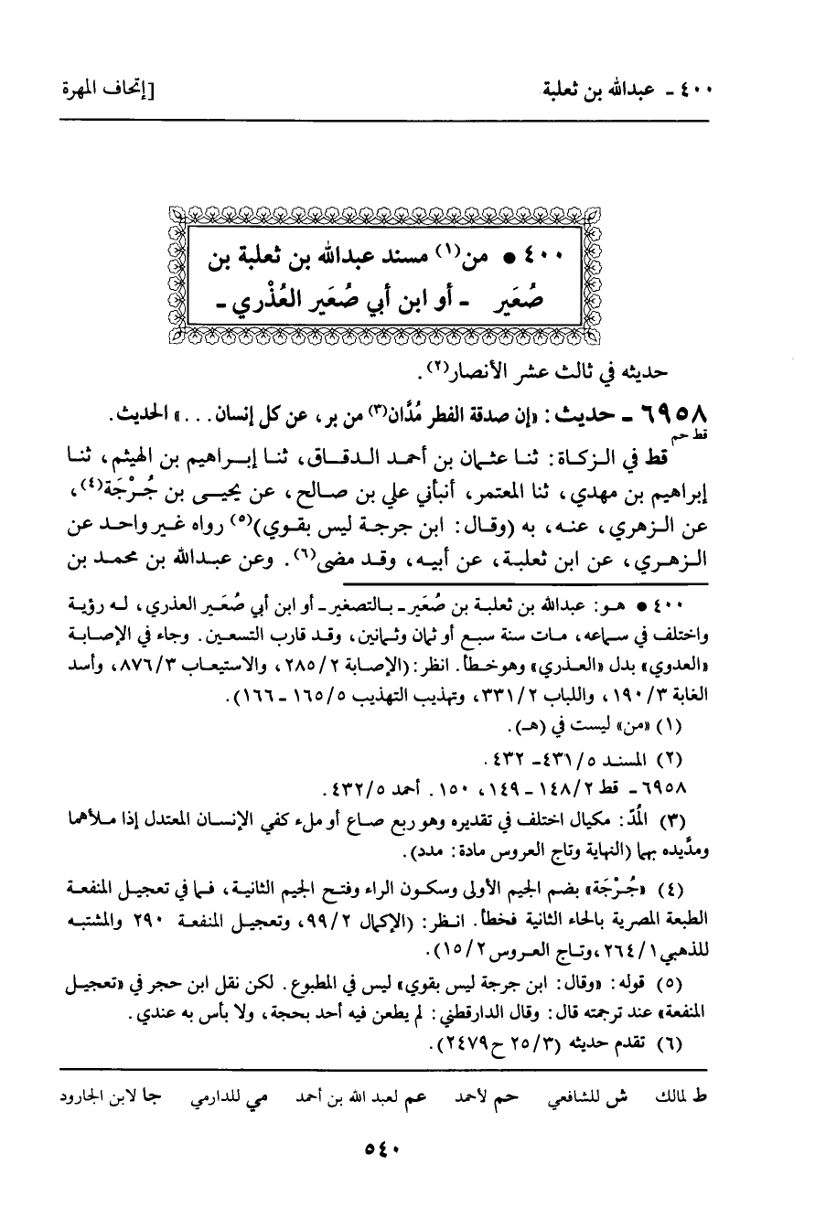 قط فِي الزَّكَاةِ: ثنا عُثْمَانُ بْنُ أَحْمَدَ الدَّقَّاقُ، ثنا إِبْرَاهِيمُ بْنُ الْهَيْثَمِ، ثنا إِبْرَاهِيمُ بْنُ مَهْدِيٍّ، ثنا الْمُعْتَمِرُ، أَنْبَأَنِي عَلِيُّ بْنُ صَالِحٍ، عَنْ يَحْيَى بْنِ جُرْجَةَ، عَنِ الزُّهْرِيِّ، عَنْهُ، بِهِ، وَقَالَ: ابْنُ جُرْجَةَ لَيْسَ بِقَوِيٍّ. رَوَاهُ غَيْرُ وَاحِدٍ، عَنِ الزُّهْرِيِّ، عَنِ ابْنِ ثَعْلَبَةَ، عَنْ أَبِيهِ، وَقَدْ مَضَى. وَعَنْ عَبْدِ اللَّهِ بْنِ مُحَمَّدِ بْنِ