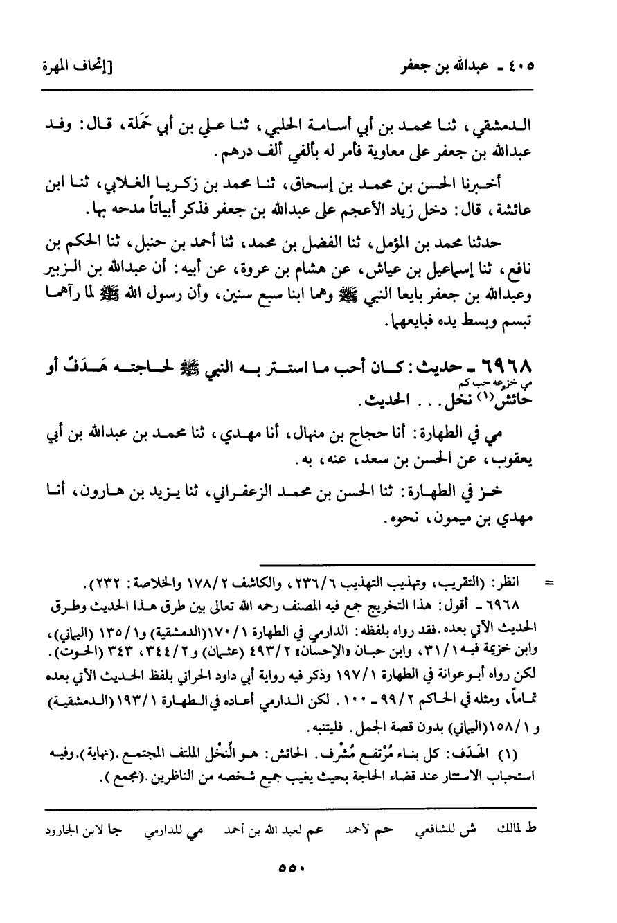 6968 - حَدِيثٌ (مي خز عه حب كم) : كَانَ أَحَبَّ مَا اسْتَتَرَ بِهِ النَّبِيُّ، صَلَّى اللَّهُ عَلَيْهِ وَسَلَّمَ، لِحَاجَتِهِ هَدَفٌ أَوْ حَائِشُ نَخْلٍ. . . الْحَدِيثَ.