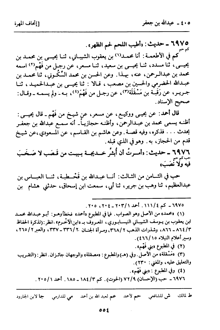 كم فِي الأَطْعِمَةِ: أنا مُحَمَّدُ بْنُ يَعْقُوبَ الشَّيْبَانِيُّ، ثنا يَحْيَى بْنُ مُحَمَّدِ بْنِ يَحْيَى، ثنا مُسَدَّدٌ، ثنا يَحْيَى بْنُ سَعِيدٍ، ثنا مِسْعَرٌ، عَنْ رَجُلٍ مِنْ فَهْمٍ، اسْمُهُ: مُحَمَّدُ بْنُ عَبْدِ الرَّحْمَنِ، عَنْهُ، بِهَذَا. وَعَنِ الْحَسَنِ بْنِ مُحَمَّدٍ السَّكُونِيِّ، ثنا مُحَمَّدُ بْنُ عَبْدِ اللَّهِ الْحَضْرَمِيُّ، وَالْحُسَيْنُ بْنُ مُصْعَبٍ، قَالا: ثنا يَحْيَى بْنُ عَبْدِ الْحَمِيدِ، ثنا جَرِيرٌ، عَنْ رَقَبَةَ بْنِ مَسْقَلَةَ، عَنْ رَجُلٍ مِنْ فَهْمٍ، بِهِ، وَلَمْ يَسْمَعْهُ، وَقَالَ: صَحِيحُ الإِسْنَادِ.