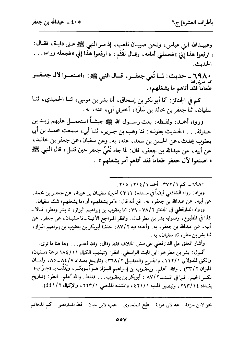 6980 - حَدِيثٌ (كم حم ش قط) : لَمَّا نُعِيَ جَعْفَرٌ؛ قَالَ النَّبِيُّ، صَلَّى اللَّهُ عَلَيْهِ وَسَلَّمَ: " اصْنَعُوا لآلِ جَعْفَرٍ طَعَامًا فَقَدْ أَتَاهُمْ مَا يَشْغَلُهُمْ ".