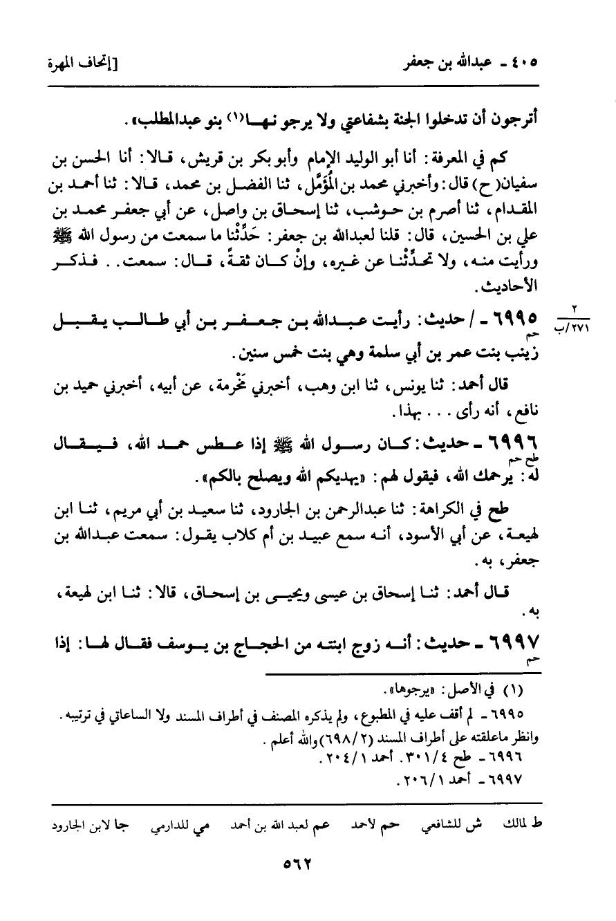 6995 - حَدِيثٌ (حم) : رَأَيْتُ عَبْدَ اللَّهِ بْنَ جَعْفَرِ بْنِ أَبِي طَالِبٍ يُقَبِّلُ زَيْنَبَ بِنْتَ عُمَرَ بْنِ أَبِي سَلَمَةَ وَهِيَ بِنْتُ خَمْسِ سِنِينَ.