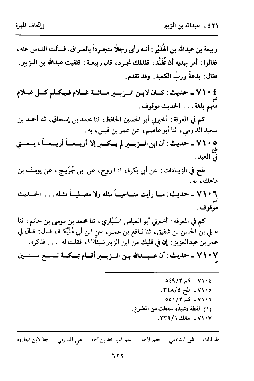 7105 - حَدِيثٌ (طح) : أَنَّ ابْنَ الزُّبَيْرِ لَمْ يُكَبِّرْ إِلا أَرْبَعًا أَرْبَعًا؛ يَعْنِي: فِي الْعِيدِ.