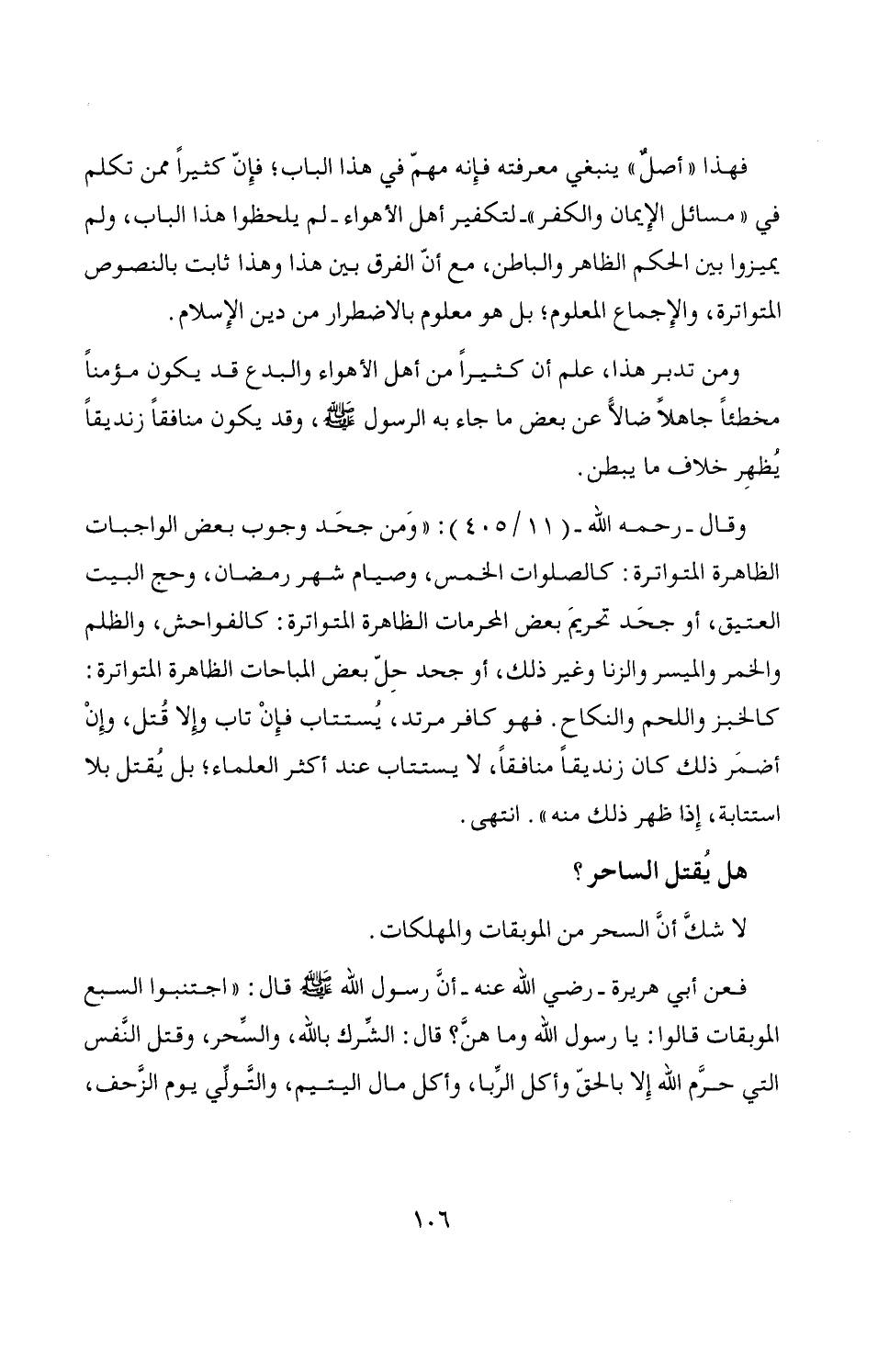 وقال -رحمه الله- (11/ 405): "وَمن جحَد وجوب بعض الواجبات الظاهرة المتواترة: كالصلوات الخمس، وصيام شهر رمضان، وحج البيت العتيق، أو جحَد تحريمَ بعض المحرمات الظاهرة المتواترة: كالفواحش، والظلم والخمر والميسر والزنا وغير ذلك، أو جحد حِلّ بعض المباحات الظاهرة المتواترة: كالخبز واللحم والنكاح. فهو كافر مرتد، يُستتاب فإِنْ تاب وإلا قُتل، وإِنْ أضمَر ذلك كان زنديقاً منافقاً، لا يستتاب عند أكثر العلماء؛ بل يُقتل بلا استتابة، إِذا ظهر ذلك منه". انتهى.