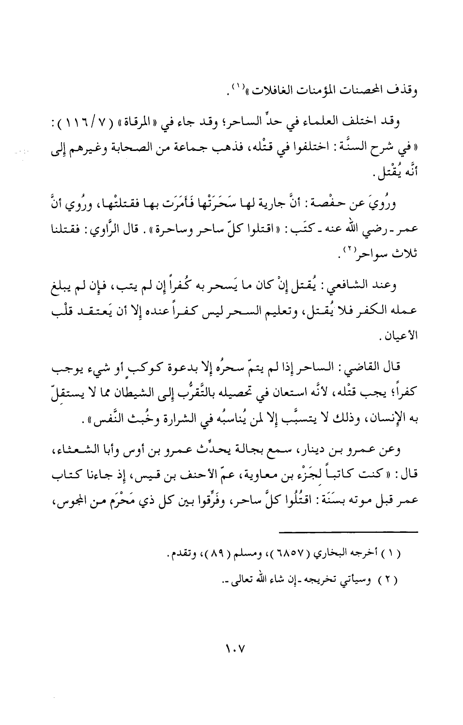 ورُويَ عن حفْصة: أنَّ جارية لها سَحَرَتْها فَأَمَرَت بها فقتلتْها، ورُوي أنَّ عمر -رضي الله عنه- كتَب: "اقتلوا كلّ ساحر وساحرة". قال الرَّاوي: فقتلنا ثلاث سواحر (¬2).