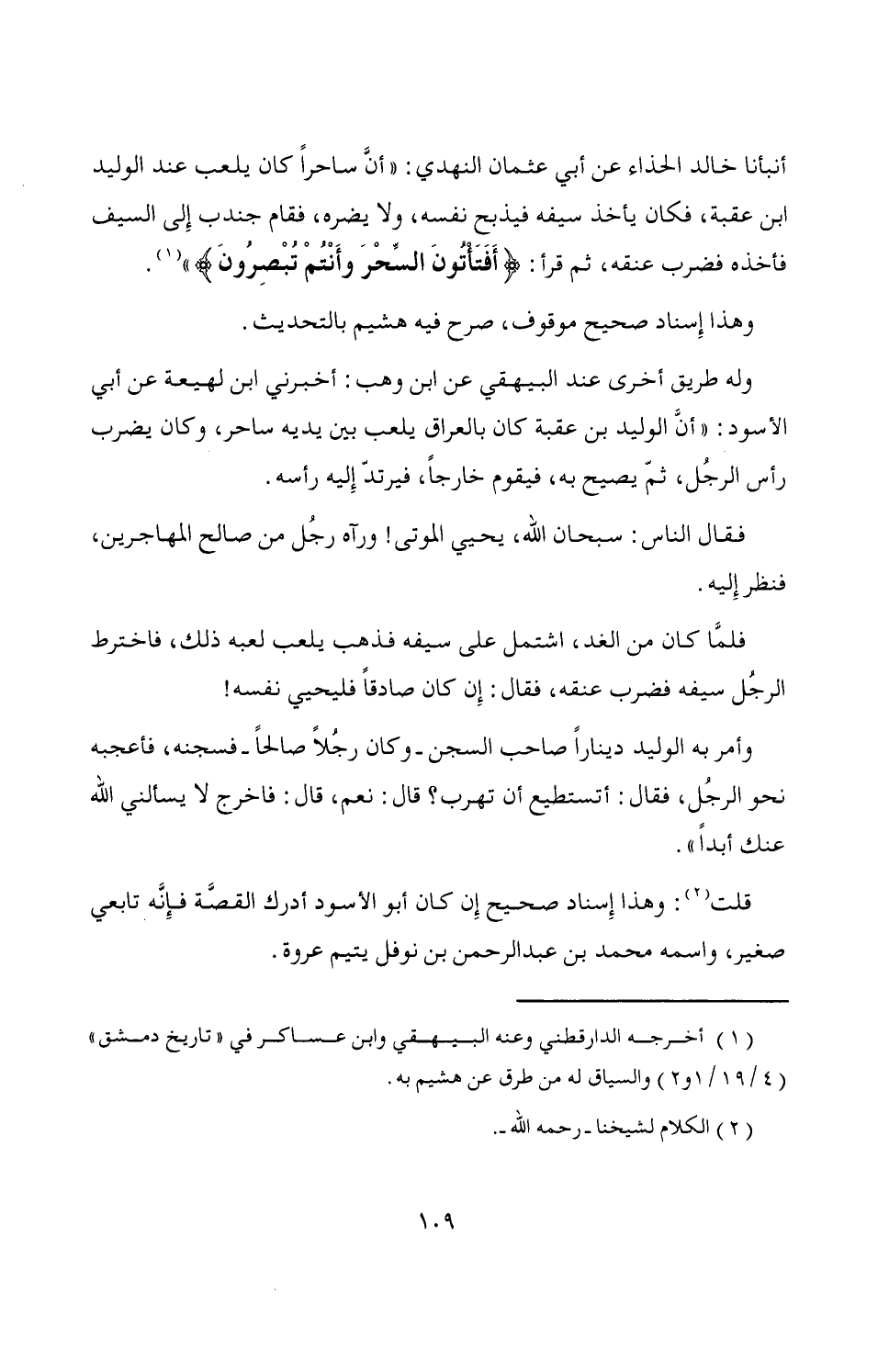 وله طريق أخرى عند البيهقي عن ابن وهب: أخبرني ابن لهيعة عن أبي الأسود: "أنَّ الوليد بن عقبة كان بالعراق يلعب بين يديه ساحر، وكان يضرب رأس الرجُل، ثمّ يصيح به، فيقوم خارجاً، فيرتدّ إِليه رأسه.