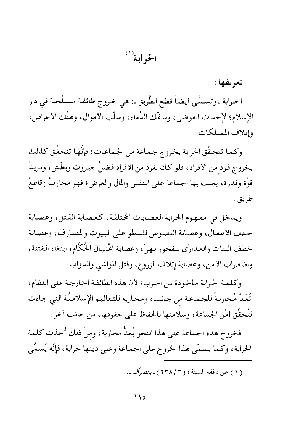 الحرابة -وتسمَّى أيضاً قطع الطَّريق-: هي خروج طائفة مسلَّحة في دار الإِسلام؛ لإِحداث الفوضى، وسفْك الدِّماء، وسلْب الأموال، وهتْك الأعراض، وإِتلاف الممتلكات.