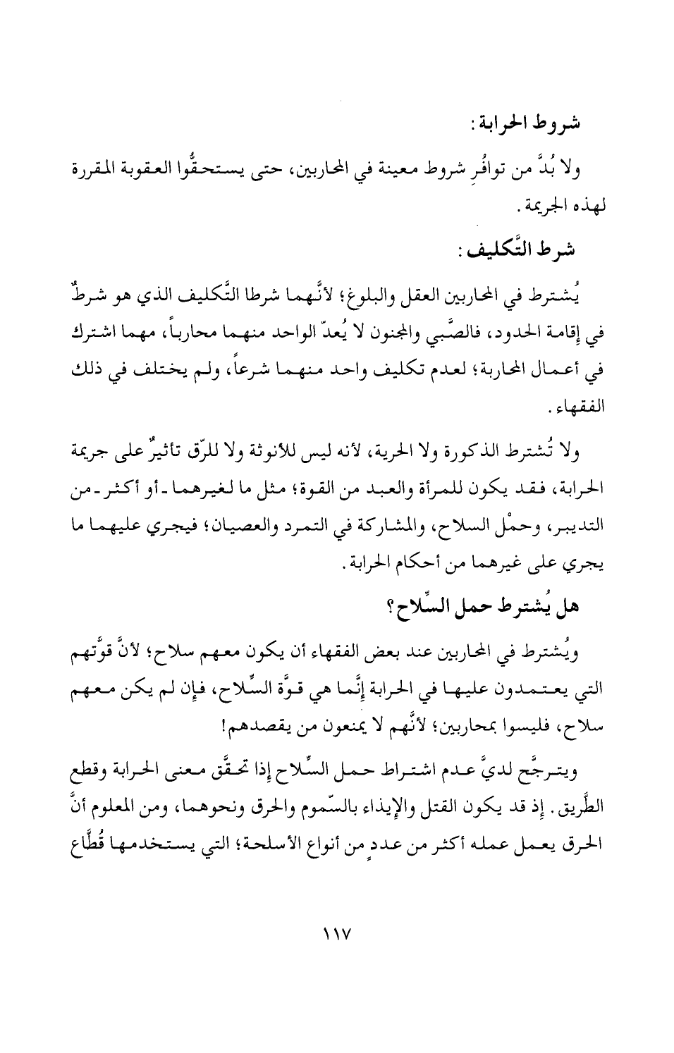 ويترجَّح لديَّ عدم اشتراط حمل السِّلاح إِذا تحقَّق معنى الحرابة وقطع الطَّريق. إِذ قد يكون القتل والإِيذاء بالسّموم والحرق ونحوهما، ومن المعلوم أنَّ الحرق يعمل عمله أكثر من عددٍ من أنواع الأسلحة؛ التي يستخدمها قُطَّاع