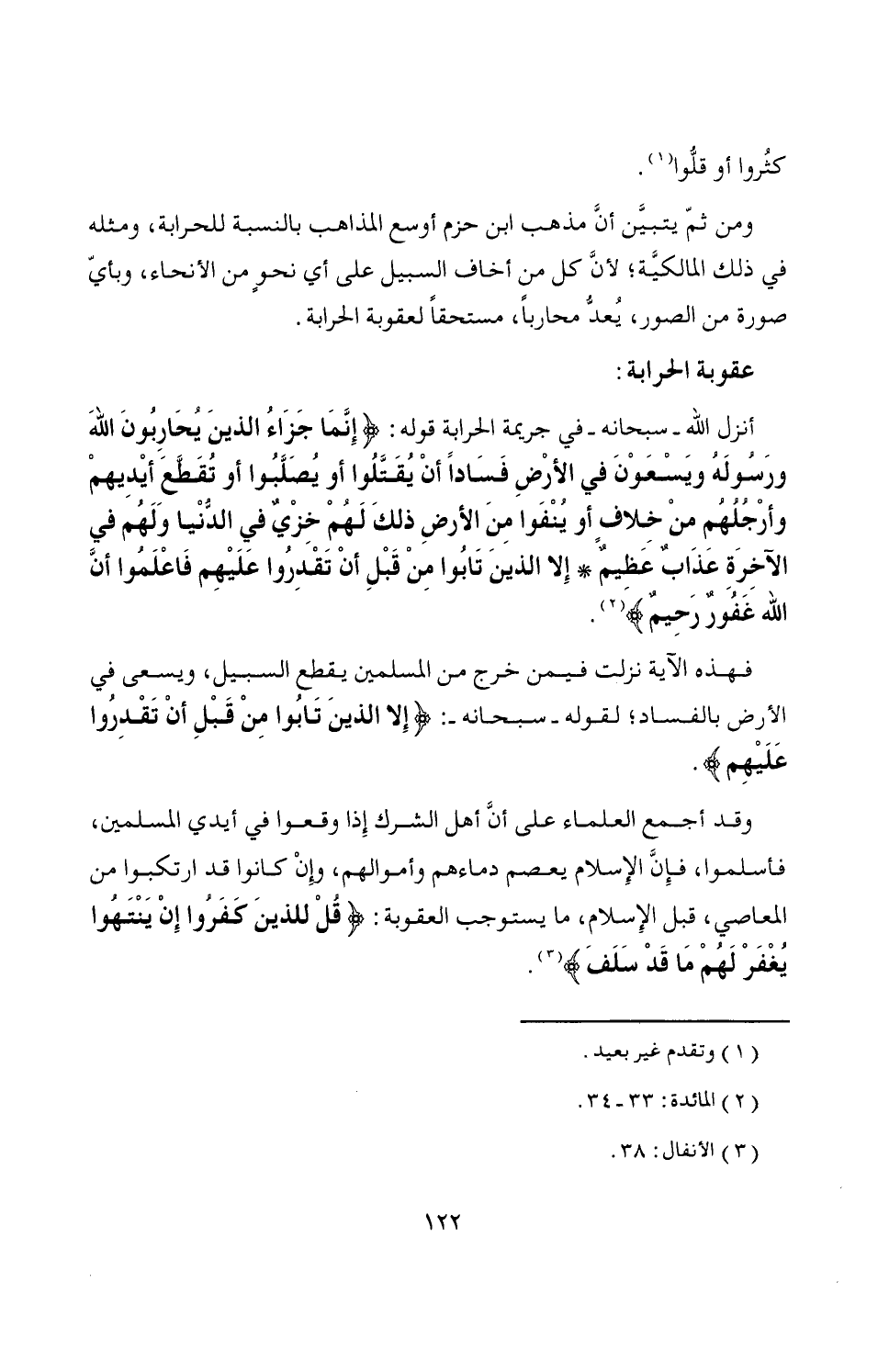 أنزل الله -سبحانه- في جريمة الحرابة قوله: {إِنَّمَا جَزَاءُ الَّذِينَ يُحَارِبُونَ اللَّهَ وَرَسُولَهُ وَيَسْعَوْنَ فِي الْأَرْضِ فَسَادًا أَنْ يُقَتَّلُوا أَوْ يُصَلَّبُوا أَوْ تُقَطَّعَ أَيْدِيهِمْ وَأَرْجُلُهُمْ مِنْ خِلَافٍ أَوْ يُنْفَوْا مِنَ الْأَرْضِ ذَلِكَ لَهُمْ خِزْيٌ فِي الدُّنْيَا وَلَهُمْ فِي الْآخِرَةِ عَذَابٌ عَظِيمٌ * إِلَّا الَّذِينَ تَابُوا مِنْ قَبْلِ أَنْ تَقْدِرُوا عَلَيْهِمْ فَاعْلَمُوا أَنَّ اللَّهَ غَفُورٌ رَحِيمٌ} (¬2).