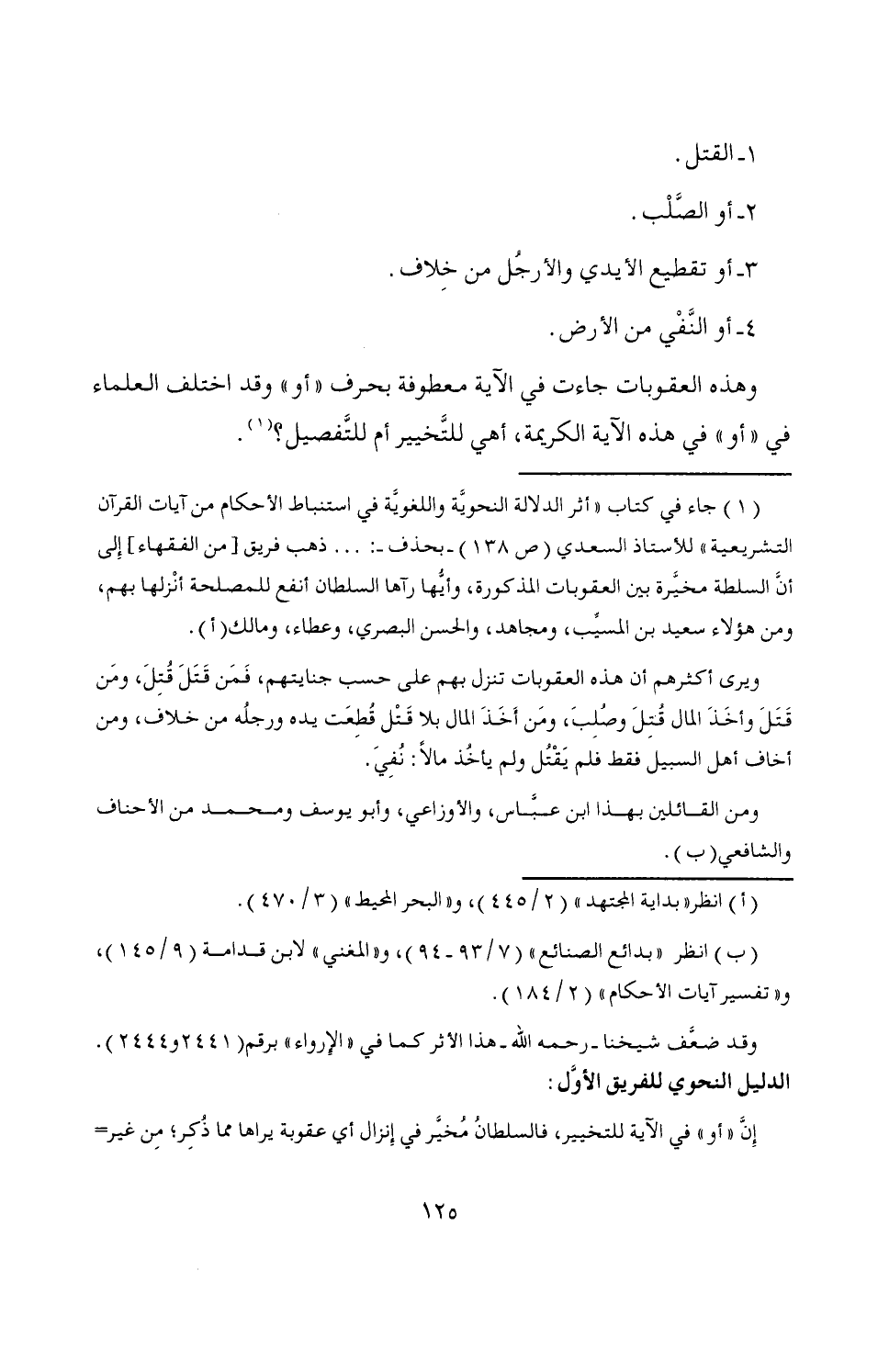 (¬1) جاء في كتاب "أثر الدلالة النحويَّة واللغوية في استنباط الأحكام من آيات القرآن التشريعية" للأستاذ السعدي (ص 138) -بحذف-: ... ذهب فريق [من الفقهاء] إِلى أنَّ السلطة مخيَّرة بين العقوبات المذكورة، وأيُّها رآها السلطان أنفع للمصلحة أنْزلها بهم، ومن هؤلاء سعيد بن المسيب، ومجاهد، والحسن البصري، وعطاء، ومالك (أ).