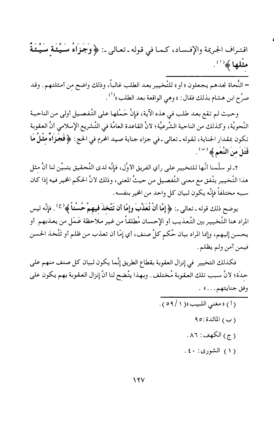 فكذلك التخيير في إنزال العقوبة بقطاع الطريق إِنَّما يكون لبيان كل صنف منهم على حِدَة؛ لأنَّ سبب تلك العقوبة مُختلف. وبهذا يتَّضِح لنا أنَّ إِنزال العقوبة بهم يكون على وفق جنايتهم ... ".