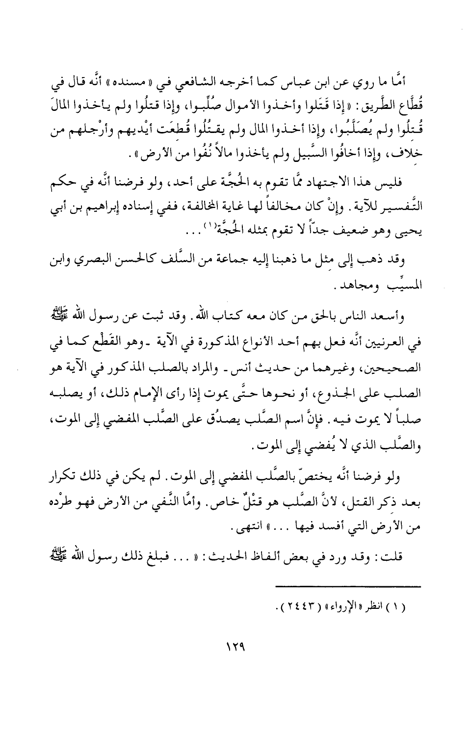 أمَّا ما روي عن ابن عباس كما أخرجه الشافعي في "مسنده" أنَّه قال في قُطَّاع الطَّريق: "إِذا قَتَلوا وأخذوا الأموال صُلِّبوا، وإِذا قتلُوا ولم يأخذوا المالَ قُتِلُوا ولم يُصَلَّبُوا، وإِذا أخذوا المال ولم يقتُلُوا قُطِعَت أيْديهم وأرْجلهم من خِلاف، وإِذا أخافُوا السَّبيل ولم يأخذوا مالاً نُفُوا من الأرض".