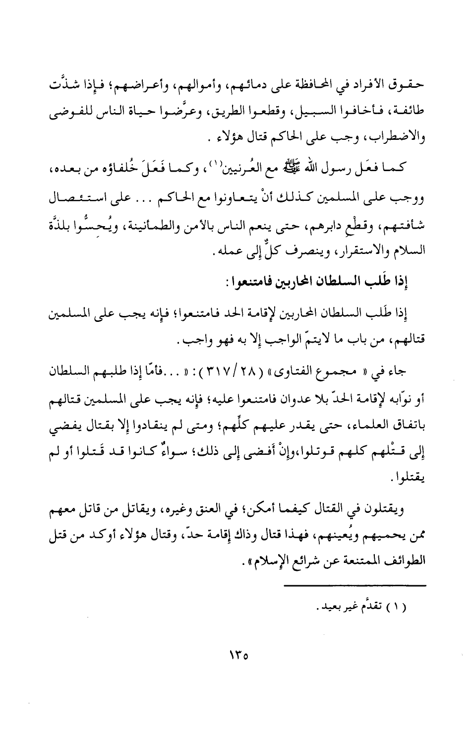 كما فعَل رسول الله - صَلَّى اللَّهُ عَلَيْهِ وَسَلَّمَ - مع العُرنيين (¬1)، وكما فَعَلَ خُلفاؤه من بعده، ووجب على المسلمين كذلك أنْ يتعاونوا مع الحاكم ... على استئصال شأفتهم، وقطْعِ دابرهم، حتى ينعم الناس بالأمن والطمأنينة، ويُحِسُّوا بلذَّة السلام والاستقرار، وينصرف كلٌّ إِلى عمله.
