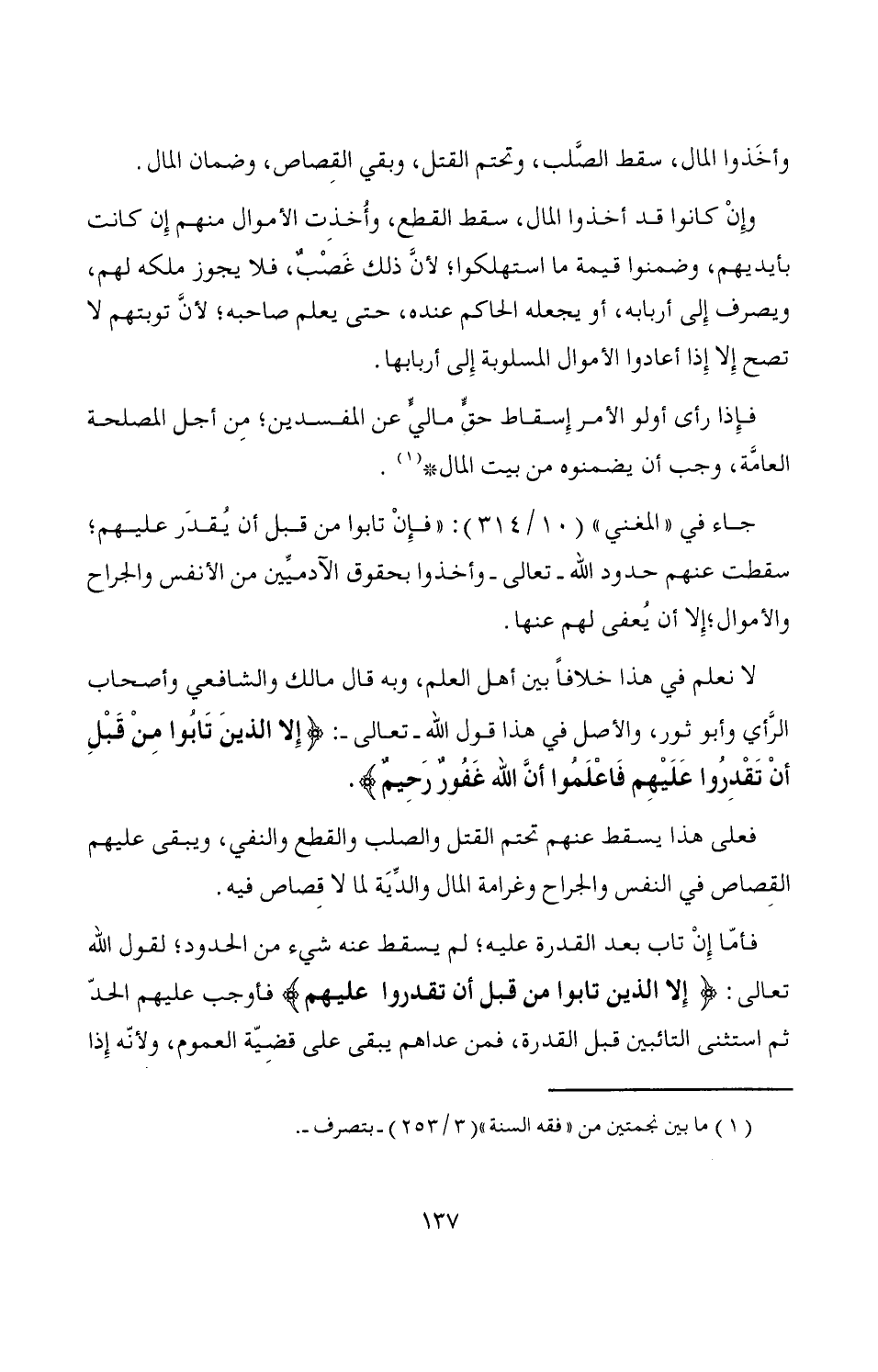 جاء في "المغني" (10/ 314): "فإِنْ تابوا من قبل أن يُقدَر عليهم؛ سقطت عنهم حدود الله -تعالى- وأخذوا بحقوق الآدميِّين من الأنفس والجراح والأموال؛ إِلا أن يُعفى لهم عنها.