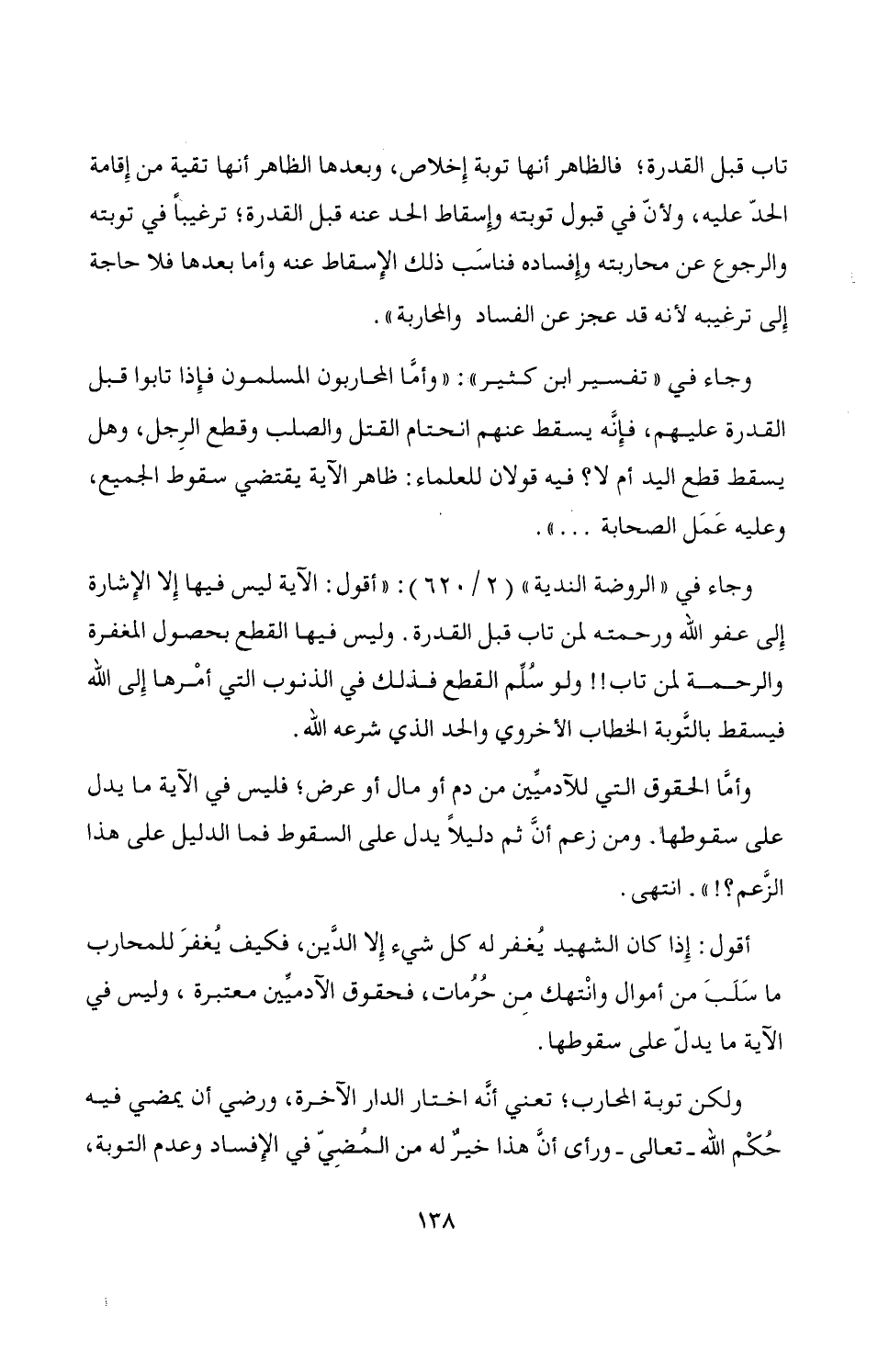 وجاء في "تفسير ابن كثير": "وأمَّا المحاربون المسلمون فإِذا تابوا قبل القدرة عليهم، فإِنَّه يسقط عنهم انحتام القتل والصلب وقطع الرِجل، وهل يسقط قطع اليد أم لا؟ فيه قولان للعلماء: ظاهر الآية يقتضي سقوط الجميع، وعليه عَمَل الصحابة ... ".