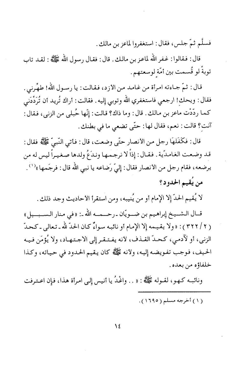 قال: ثمّ جاءته امرأة من غامد من الأزد، فقالت: يا رسول الله! طهِّرني. فقال: ويحكِ! ارجعي فاستغفري الله وتوبي إِليه. فقالت: أراك تُريد أن تُرَدِّدَني كما ردّدْت ماعز بن مالك. قال: وما ذاك؟ قالت: إِنّها حُبلى من الزنى، فقال: آنتِ؟ قالت: نعم، فقال لها: حتّى تضعي ما في بطنك.