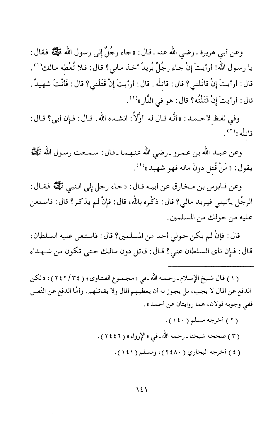 (¬1) قال شيخ الإِسلام -رحمه الله- في "مجموع الفتاوى" (34/ 242): "لكن الدفع عن المال لا يجب، بل يجوز له أن يعطيهم المال ولا يقاتلهم. وأمًا الدفع عن النَّفس ففي وجوبه قولان، هما روايتان عن أحمد".