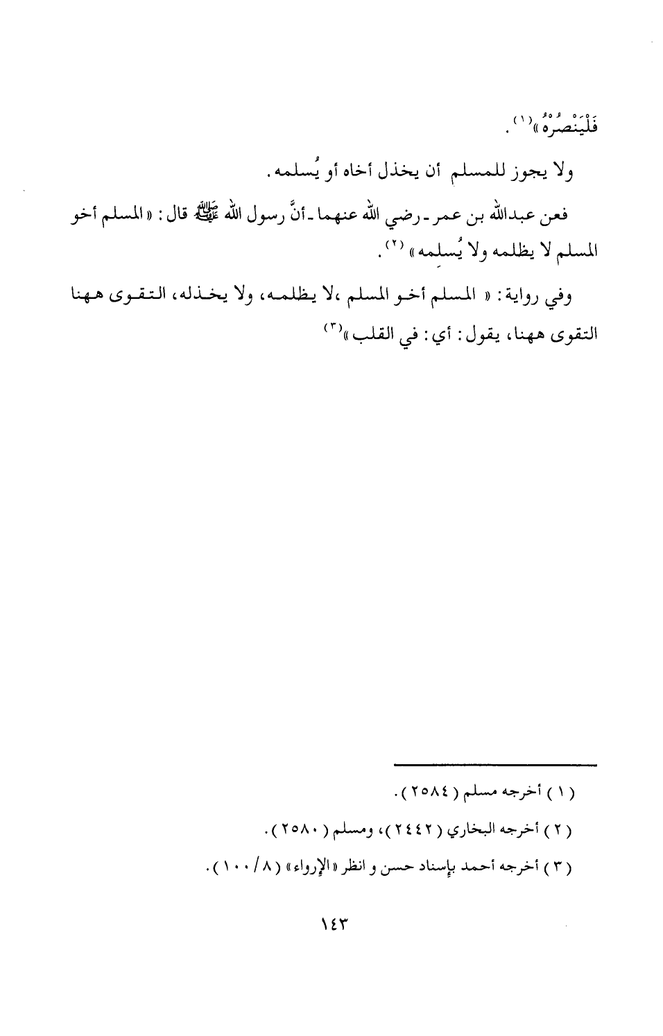 فعن عبد الله بن عمر -رضي الله عنهما- أنَّ رسول الله - صَلَّى اللَّهُ عَلَيْهِ وَسَلَّمَ - قال: "المسلم أخو المسلم لا يظلمه ولا يُسلِمه" (¬2).