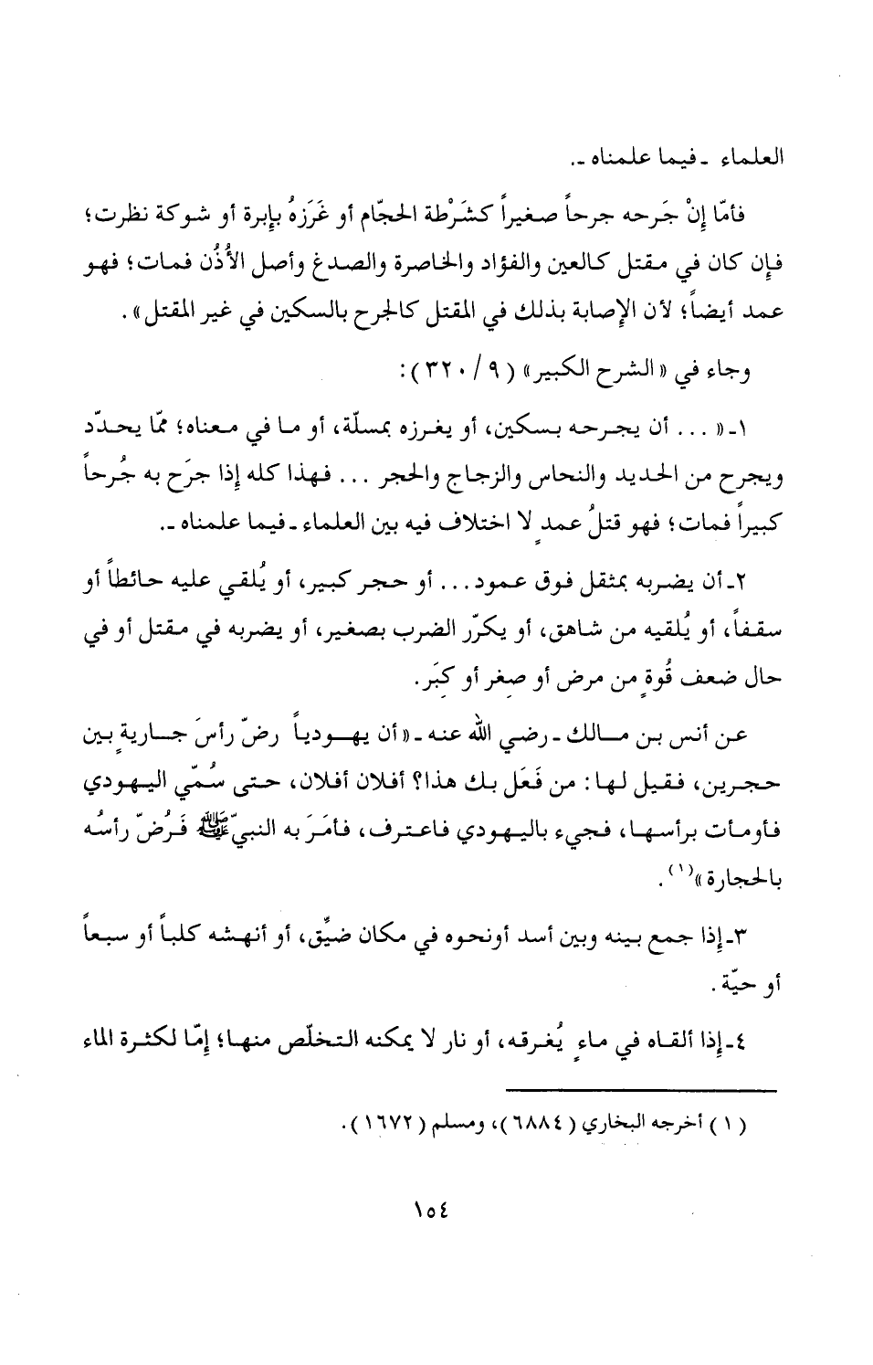 1 - " ... أن يجرحه بسكين، أو يغرزه بمسلّة، أو ما في معناه؛ ممّا يحدّد ويجرح من الحديد والنحاس والزجاج والحجر ... فهذا كله إِذا جرَح به جُرحاً كبيراً فمات؛ فهو قتلُ عمدٍ لا اختلاف فيه بين العلماء -فيما علمناه-.
